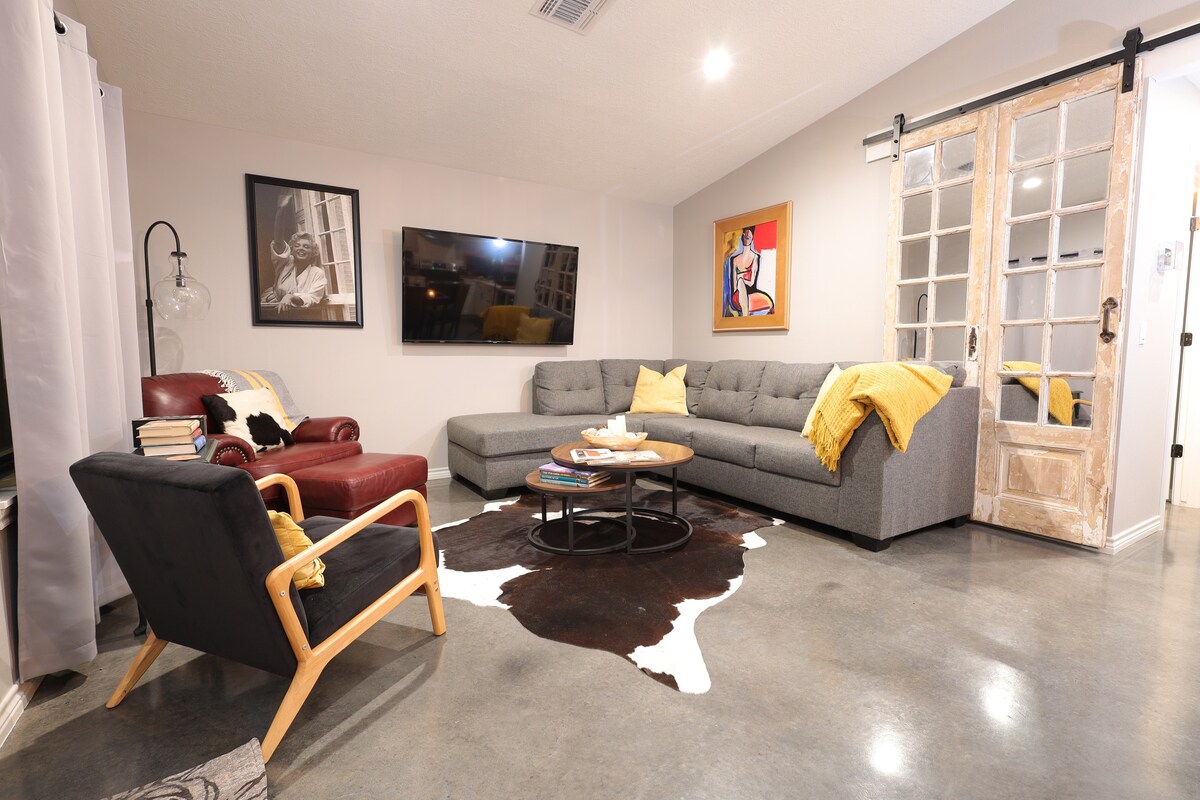 Un cottage di 28 metri quadrati con servizi moderni e un tema industriale, immerso in tranquillità su una vecchia strada agricola alla periferia di Round Top, in Texas, con ingresso SENZA CHIAVE (nessuna chiave con cui preoccuparsi). Il Yellow Rose Cottage è stato progettato per il comfort dei nostri ospiti. Nota: abbiamo un totale di 5 cottage sulla proprietà per gruppi più grandi. Padiglione di 390 metri quadrati con un'area comune disponibile per l'affitto. Contatta Eva per maggiori informazioni.
