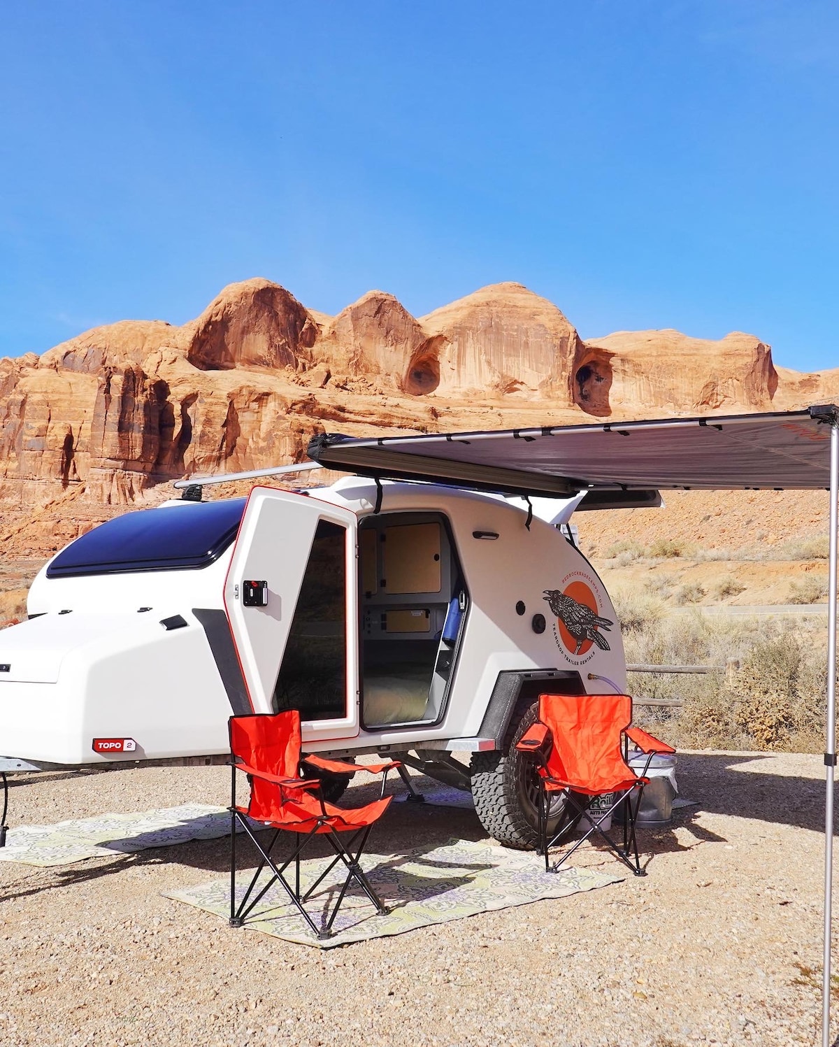 Non c'è niente di meglio della sensazione di trascorrere la notte all'aria aperta e non c'è modo migliore per vivere l'incredibile deserto di roccia rossa di Moab. Questo trailer top of the line renderà la tua esperienza in campeggio un'esperienza glamping! Saluta la bellezza del deserto mentre cucini la colazione nella nostra cucina all'aperto ben attrezzata. Consegniamo nel tuo campeggio. Non c'è bisogno di rimorchiare! Metti in sicurezza il tuo campeggio e al resto ci pensiamo noi.