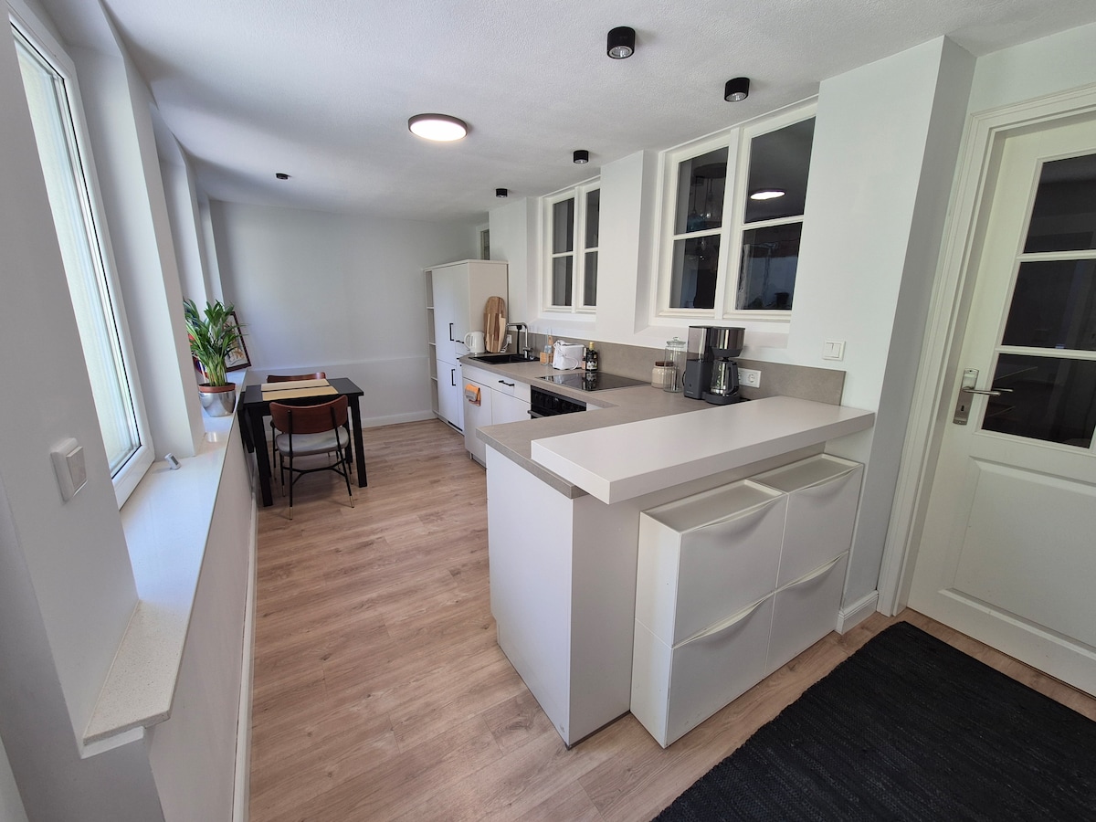 Con amore e cura abbiamo creato con tanta passione un appartamento da sogno di 70 mq per 2 (fino a 4) persone su 2 livelli - la zona notte si trova al piano superiore inondato di luce. Si prega di notare che l'unica porta è quella del bagno - il resto è aperto. Abbiamo cercato di costruire nel modo più sostenibile, ecologico e di alta qualità possibile - i colori sono del periodo del gesso, le vernici a base d'acqua.