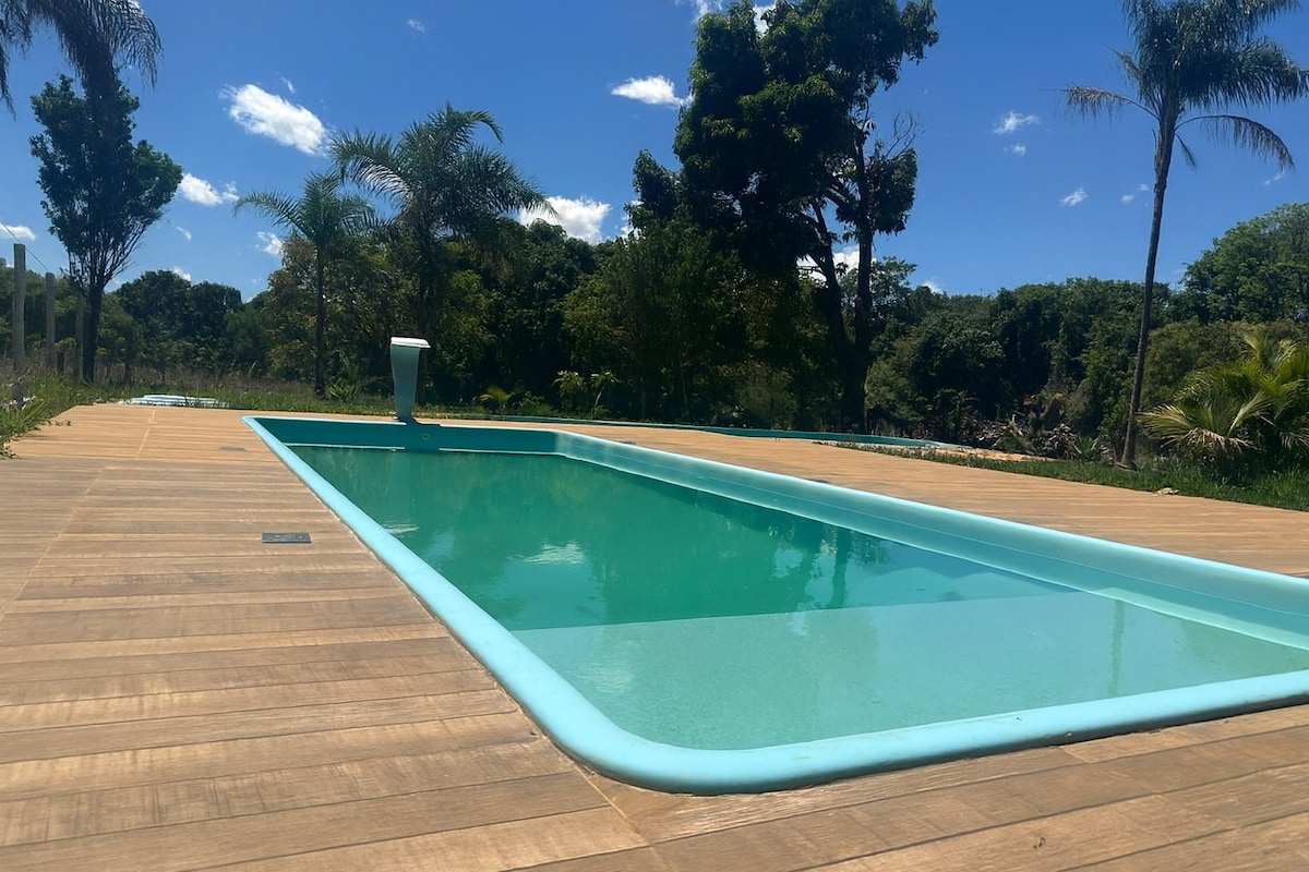 Mini chácara a soli 15 minuti da Formosa e a 10 minuti dalla cascata di Itiquira. Accesso GO 116, 200 metri dall'asfalto. Casa con 2 camere da letto, 1 suite, soggiorno con TV via cavo, abbiamo due letti matrimoniali nella camera degli ospiti + 1 letto singolo (forniamo 1 materasso matrimoniale in più). 2 bagni interni + 1 esterno. Piscina riscaldata, Wi-Fi, aria condizionata, doccia, parco giochi, cucina completa, barbecue, forno e stufa a legna. Sito prato e circondato da tela (permette di far cadere il proprio animale domestico).