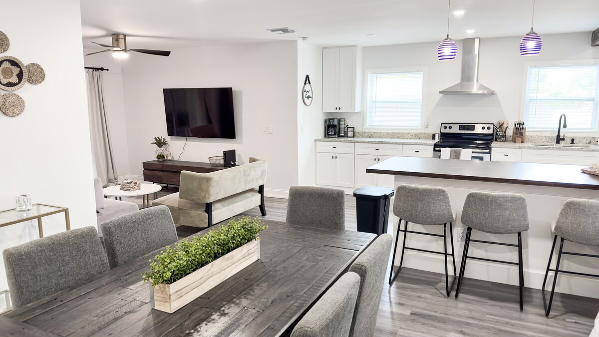 Welcome to The Palm — a fire pit oasis near Jensen Beach. Unwind in the private backyard, relax in the screened patio with smart TV and hanging chairs, or cook in the fully stocked modern kitchen. Just minutes from Jensen Beach, Stuart Beach, and historic downtown Stuart, this home is perfect for families, couples, and remote workers. Enjoy fast Wi-Fi, memory-foam beds, and kid-friendly extras like a pack & play and changing station.