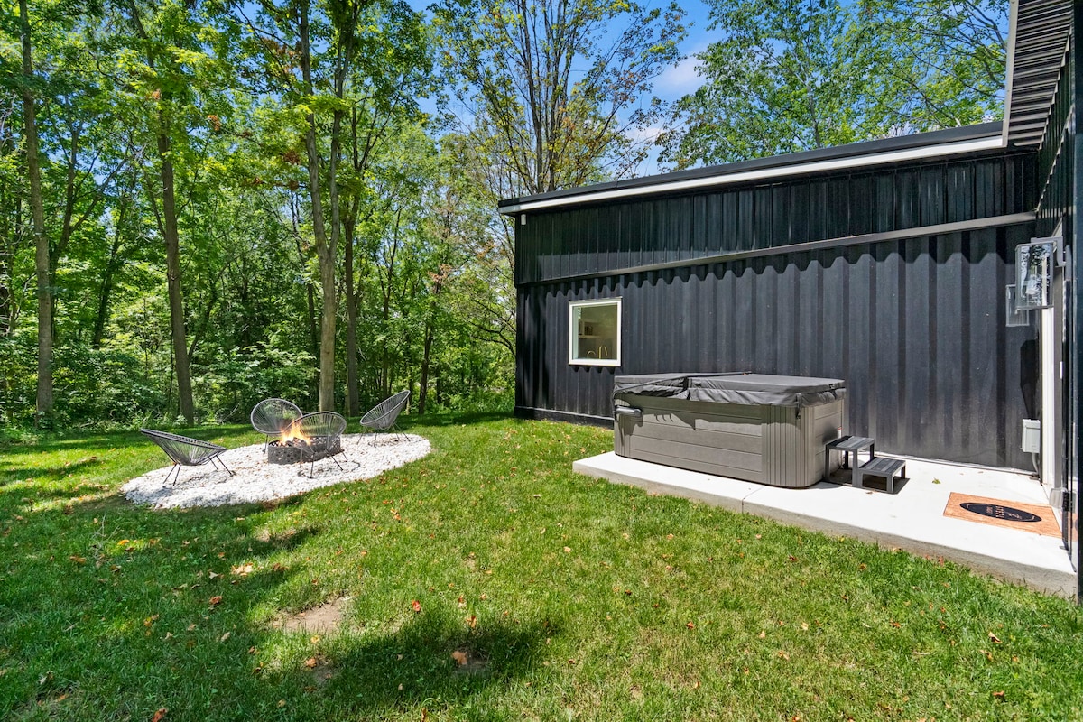 Welcome to our modern shipping container home, tucked away in a 3 acre section of woods. This 40 foot high cube has been transformed into the perfect place to allow you to relax and escape reality. This Oasis includes everything from a porch swing daybed, hot tub, fire pit, and dual sided fireplace. The details are unmatched.