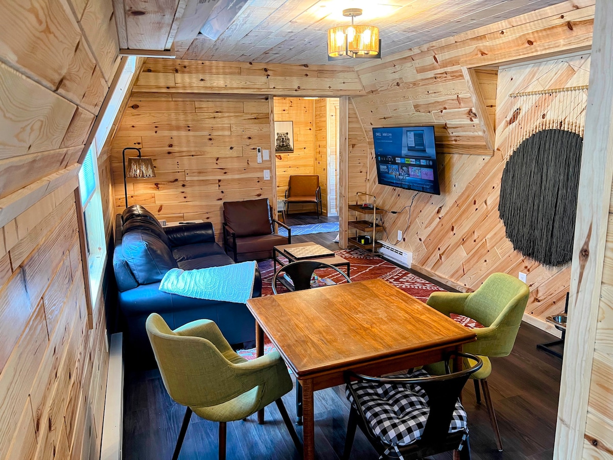 Questa minuscola baita di 32 metri quadrati si trova a pochi passi dall'inizio del sentiero Meadows, a Luzerne. A un isolato a est del famoso ristorante Ma Deeters. Questo chalet pulito e accogliente è il luogo ideale per rilassarsi tra i sentieri, i fiumi e i negozi Amish locali. Un letto matrimoniale nel soppalco e un divano letto estraibile a una piazza e mezza. Focolare 4 stagioni sul retro. Nell'area del focolare è disponibile anche una griglia a propano. Perfetto per una fuga di coppia, per divertirsi in piccola famiglia o per un weekend tra ragazzi! Scrivici in qualsiasi momento! :)