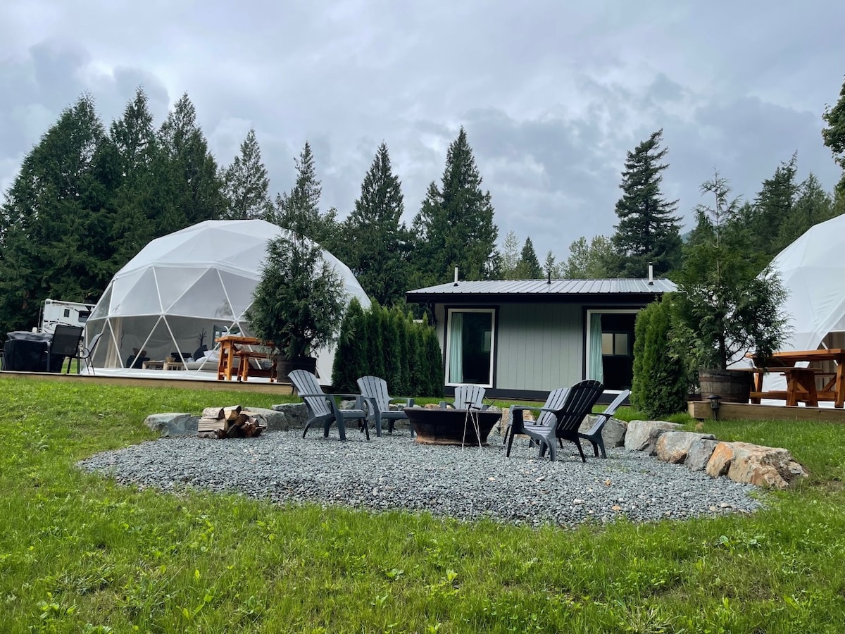 Si tratta di una proprietà unica sul lungomare con 2 cupole e una vasca idromassaggio a legna. Queste lussuose cupole sono dotate di elettricità e utensili per cucinare e di un terrazzo privato a pochi passi dal fiume Fraser. Ogni cupola ha un barbecue Weber, un tavolo da picnic, un tavolo da caminetto a propano e c'è un braciere comune a legna con legna. Situato nel canyon di Fraser, a soli 15 minuti a nord di Hope, a.C. dalla Highway 1.