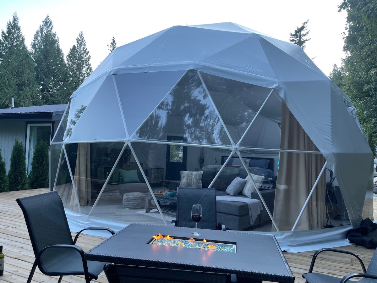 Il glamping in una cupola geodetica romantica al suo meglio! Ammira il cielo mentre ti addormenti nella nostra Geodome privata e tranquilla, *non allacciata alla rete elettrica*, nel North Shuswap. La nostra superficie privata è per lo più non edificata, quindi puoi tornare alla natura e goderti un pezzo poco affollato del paradiso di Shuswap. A soli 2 minuti di auto o 30 minuti a piedi da una spiaggia pubblica. Il glamping in geodome è fantastico se ti piace il campeggio nell'entroterra e stai cercando di riconnetterti con la natura; ma, per essere chiari, è essenzialmente una tenda nel bosco.