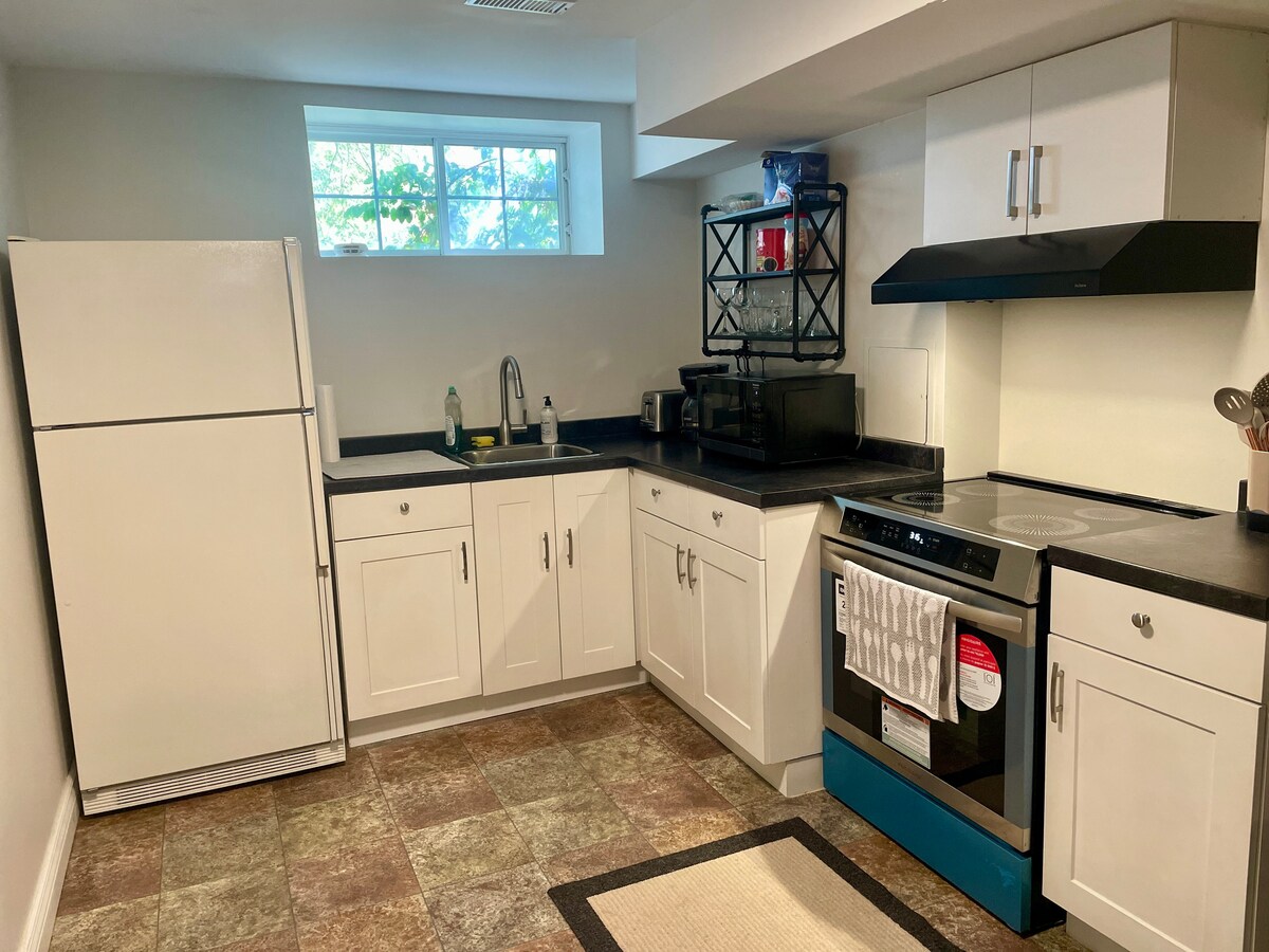 Appartamento seminterrato PRIVATO con ingresso indipendente. Spazio di 39 metri quadrati. Letto matrimoniale. Doccia di grandi dimensioni con soffione a pioggia. Microonde, due mini frigoriferi, macchina per caffè/tè con acqua calda. Nota: non è una cucina completa. Tavolo da pranzo/lavoro con panche. Wifi ad alta velocità. Soggiorno con divano reclinabile Lazy Boy e Smart TV da 50 pollici. Oltre 1.000 canali TV in diretta e Netflix. Piccolo patio privato con tavolo. Vialetto privato (2 auto). 1 minuto di auto dalla Highway 401. A 15 minuti a piedi dalla stazione Ajax GO.