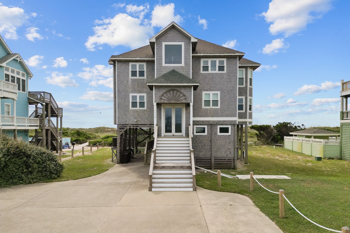 Viste fronte oceano e una piscina privata! All'aperto: spiaggia poco affollata, una grande piscina, un bar Tiki, una vasca idromassaggio, una fossa a ferro di cavallo, un cerchio da basket e altalene per il divertimento in famiglia. All'interno - Una sala giochi con tavolo da air hockey, grande TV, impianto stereo e un frigorifero grande, bevande da piscina perfette. TV in ogni camera da letto e grande sala e doppi elettrodomestici in cucina. Comodo posto auto coperto, ripostiglio per l'attrezzatura da spiaggia, doccia esterna privata, ampio lavandino e bancone vicino alla griglia a gas (con gas). I LETTI SONO FATTI!
