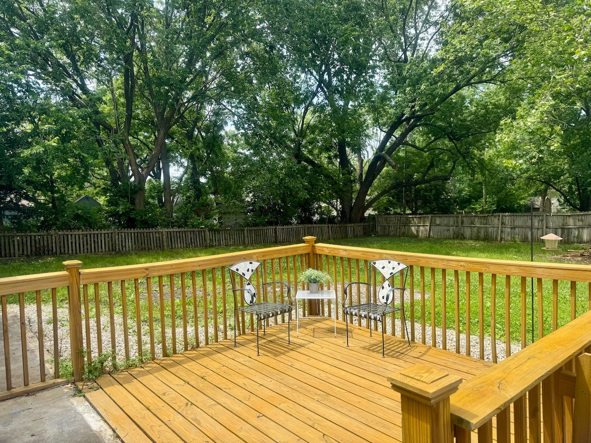 Ti diamo il benvenuto nella nostra adorabile e funzionale casa con 2 camere da letto recentemente ristrutturata e dotata di cortile recintato per il tuo amico a quattro zampe. Questa è la nostra casa lontano da casa. Ti auguriamo un piacevole soggiorno con caratteristiche speciali, come un grande patio coperto all'aperto per giocare a Jenga di grandi dimensioni, cornhole o grigliare un po' di carne alla griglia! Situato in posizione centrale vicino alla I-35, offre facile accesso a ristoranti, negozi e intrattenimento in tutta la contea di Johnson e nella Greater Kansas City. Arredi nuovi di zecca e completamente riforniti. Letto king-size più divano letto convertibile in due letti singoli o in un altro king-size!