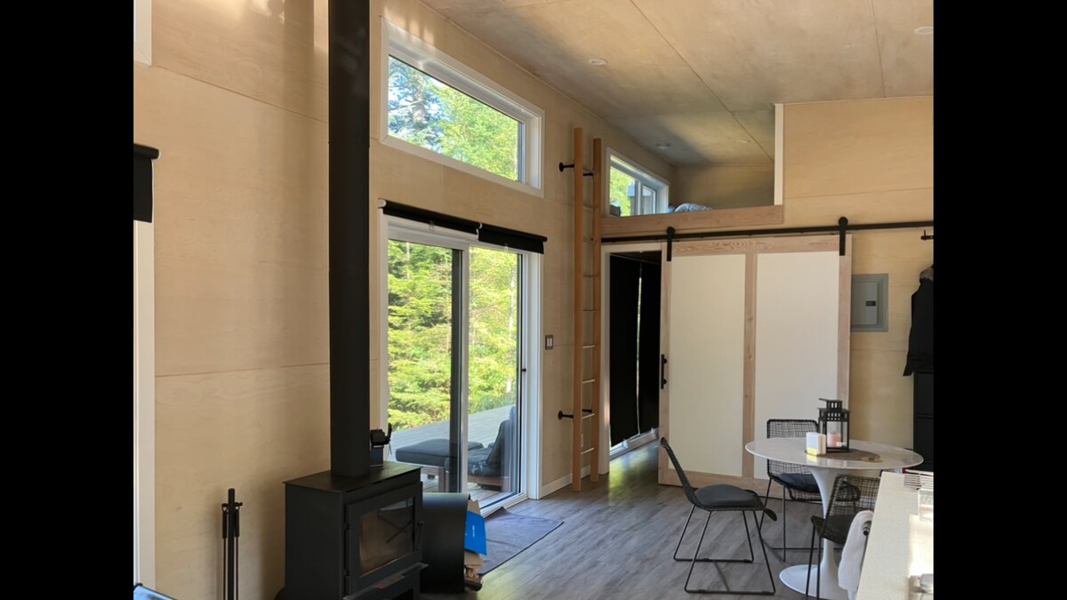 A nature retreat, where you can soak beneath the stars in PRIVATE HOT TUB year-round…sun, rain, or snow! A covered deck with cozy furniture. Wrap up in a blanket and sit by the propane fire table, sipping from gold rimmed glasses. Fully stocked kitchen! Wander mossy riverside trail where you won’t see anyone. Beautiful tiny home, wooden swings hang by thick hemp rope at your own outdoor breakfast bar. Hike to a lake from here, go fishing, ski Whistler. Drift off to sleep in luxury linens.