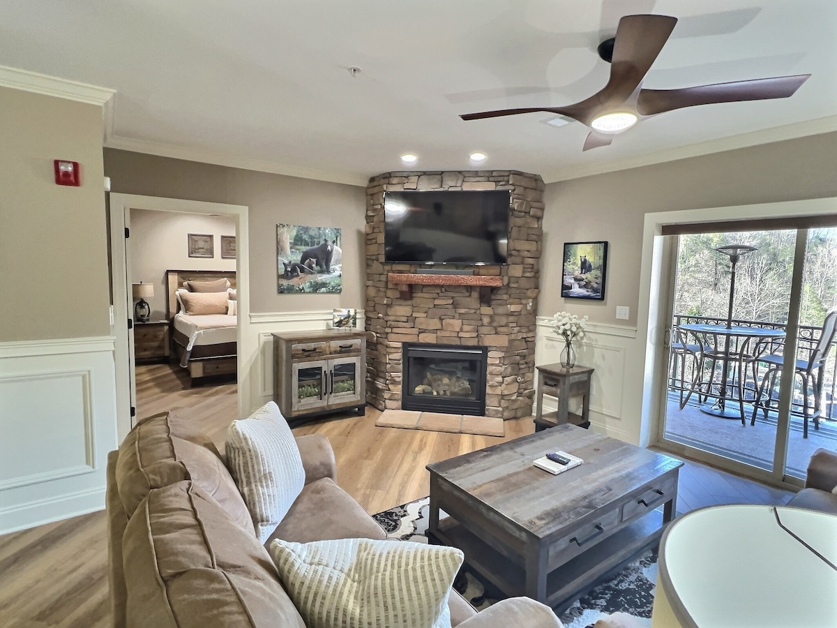 🏡Unità Deluxe King con una camera da letto, presso Windy Oaks Apartments. Appartamento completamente ristrutturato, con 🔥CAMINO elettrico JACUZZI PRIVATA🛀 INTERNA ⛱PISCINA e 🚘PARCHEGGIO GRATUITO in loco, cucina completa, 1 letto king size, 1 divano letto (queen size) e balcone con vista spettacolare su Sky Bridge e Space Needle. Vista dei FUOCHI D'ARTIFICIO del🎆 4 luglio. A pochi📍 minuti dalla famosa strada di Gatlinburg, ristoranti, attività e dal Parco Nazionale delle Great Smoky Mountains Dispositivo di🎥 registrazione davanti alla porta per sicurezza!