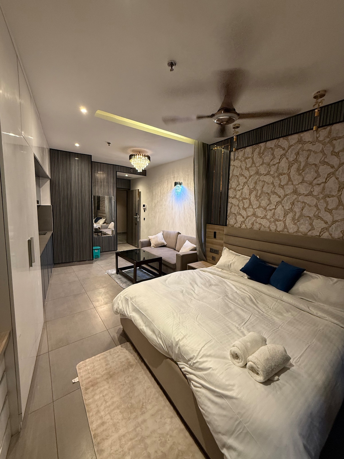 Benvenuti in questa bella e accogliente proprietà di Tulip Homes. Si trova al 16° piano ed è un appartamento completamente rinnovato con patio con giardino, che lo rende unico nel suo genere. Il posto è perfetto per rilassarsi e godersi la vista panoramica dell'architettura moderna. L'appartamento è dotato di smart TV (tutte le applicazioni funzionano), grande parete a specchio, un comodo letto matrimoniale, ampio armadio con armadietto, divano a 5 posti, eleganti tavolini da caffè, frigorifero, forno a microonde, induzione, bollitore elettrico, tostapane, ferro da stiro e molto altro