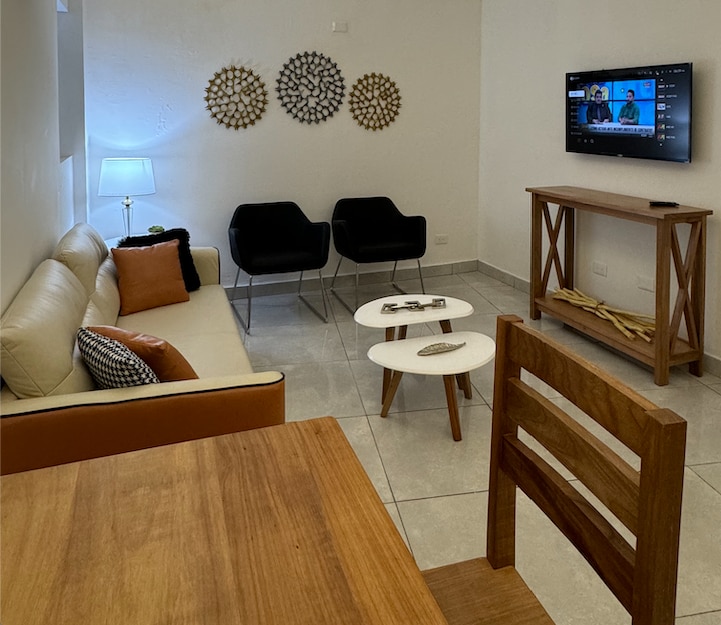 BRAND NEW- 1 Bedroom apartment: - 2 smart TV’s -2 new AC units -New washer & dryer - Safe - High speed internet - Smart front lock - LED lights - electric wine opener -blow dryer - Steamer - 1 parking space (under roof) Kitchen fully equipped (incl an air fryer) Rooftop Terrace: - PICUZZI + GYM with an amazing view. Location: - Downtown of SD. Safe neighborhood, and minutes from El malecón & Zona Colonial. Ask about the romantic set up with champagne or wine bottles and chocolate