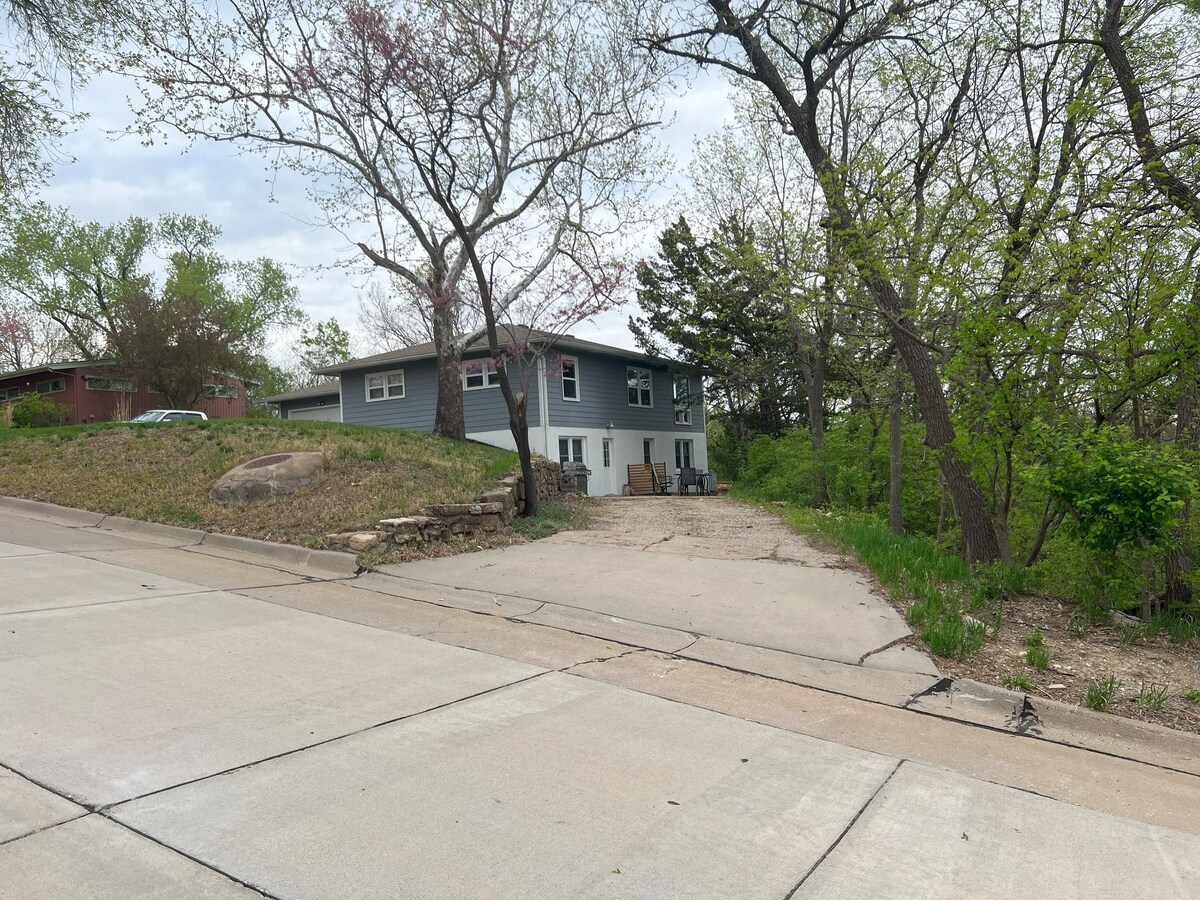 Goditi la vista di Manhattan dalla nostra tranquilla suite in collina con due letti/1 bagno nel seminterrato, con ingresso privato, termostato, wifi gratuito, bagno completo con vasca/doccia e una stanza con mini frigo, forno a microonde e TV. Parcheggio in loco con gradini in pietra che conducono a un ingresso privato nel cortile sul retro, con un braciere per rilassarsi sotto le stelle. Facile accesso al campus della KSU, allo stadio, ad Aggieville e a Ft. Riley. Gli ospiti accedono allo spazio separato con self check-in. I proprietari vivono al piano superiore.