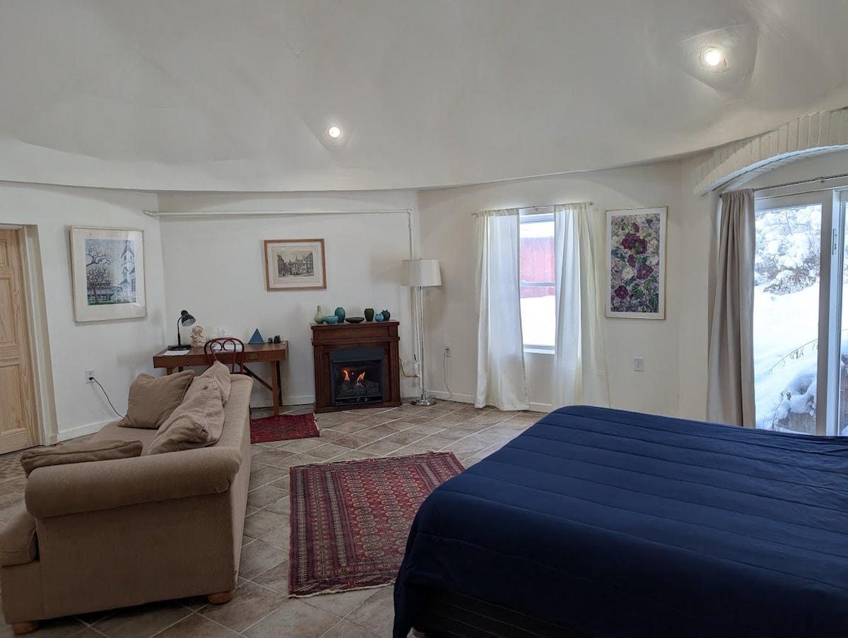 Un luogo tranquillo e spazioso nei boschi, con tetti in muratura unici, come archi e cupole. Tanti tocchi artistici, tanti libri, un fantastico stereo e tutti i servizi. A meno di un miglio dalla città, con oltre 25 ettari di bosco in cui passeggiare. Soffitti alti e riscaldamento a pavimento radiante lo rendono spazioso e accogliente. Lavatrice e asciugatrice incluse.