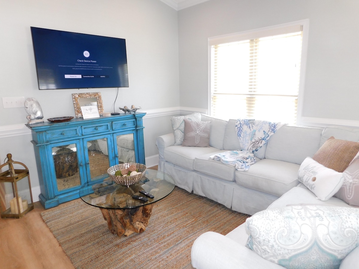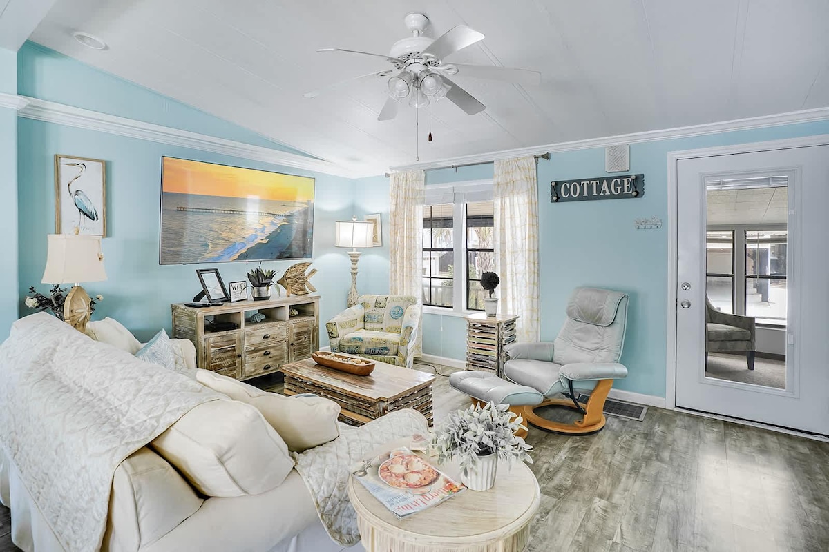 The perfect pet friendly family getaway for someone wanting peaceful/ beautiful surroundings, but wants access to all the action. Ground level apart. separate LR, queen BR, full bath, fully stocked kitchenette, microwave, fridge, 2 burner stove, convection oven/air fryer TV, AC/heat, wifi. Private parking. Use of the fire pits, pizza oven, grills, kayaks, gym and bikes. The beach is just a short 3 mile drive. Boat landing is just down the road, bring your boat and park it in driveway.