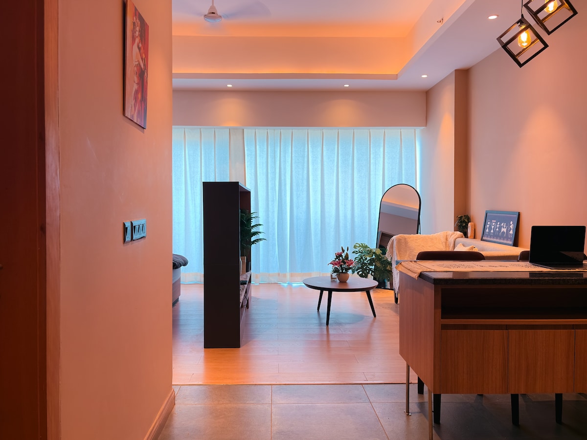 A Premium 1 BHK Apartment in Gurgaon. Welcome to Stayflix & Chill, cosy and a relaxed urban Located in the heart of Gurgaon. Your premium 1BHK in the heart of the action. From Starbucks mornings to CyberHub nights, enjoy instant access to Gurgaon’s best entertainment and work hubs. Fully equipped kitchen High-speed Wi-Fi & Smart TV (Netflix & Amazon Prime ready 😉) Comfortable bedroom with premium bedding.