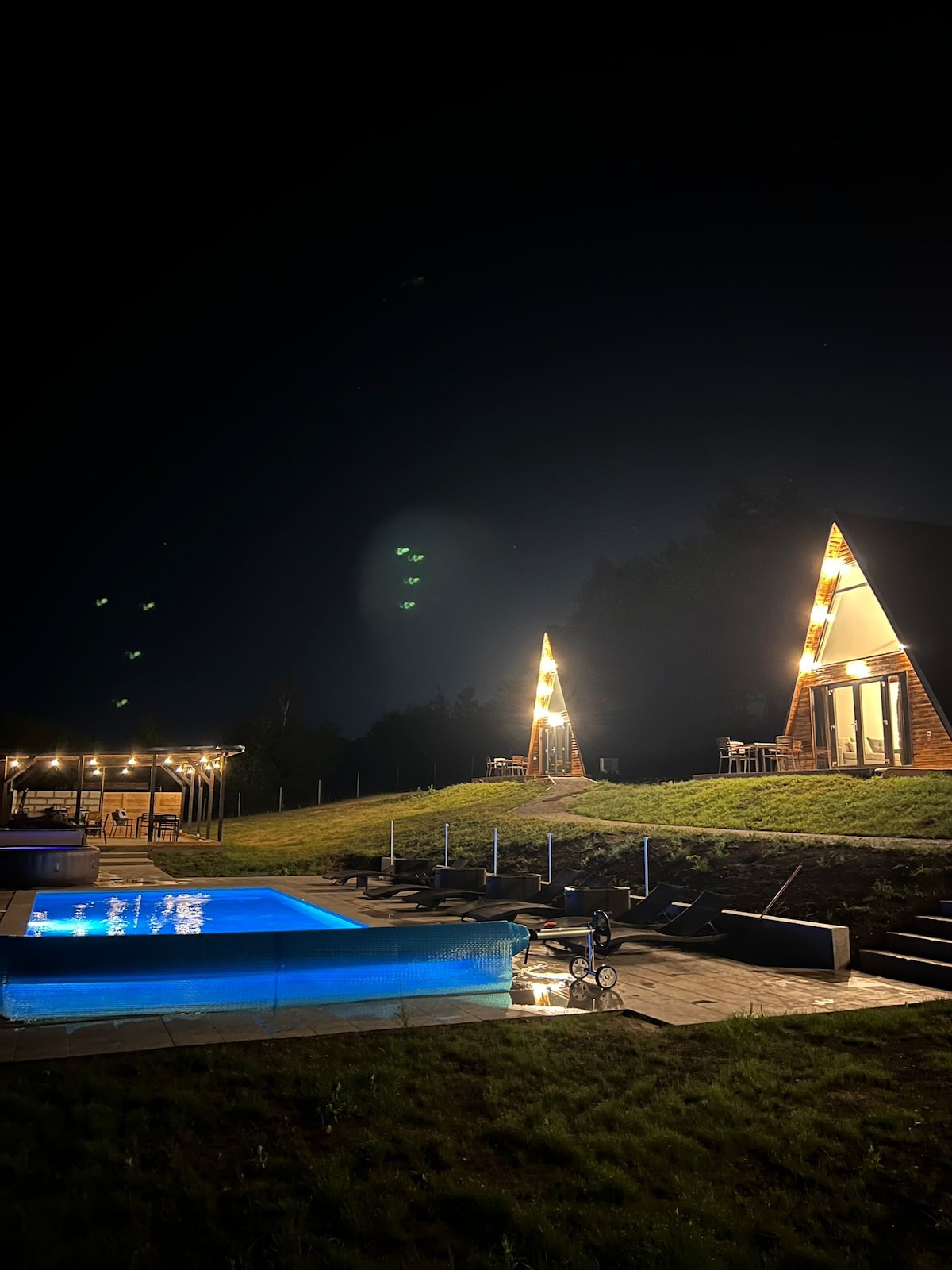 Resort con 4 cabine a forma di A, ciascuna per 4 persone, immerso nella natura. Terrazze private, piscina esterna illuminata e riscaldata, gazebo rustico e atmosfera rilassante. Ideale per coppie, famiglie o piccoli gruppi. Tranquillità, comfort e natura. Servizi in ogni cottage: • Capacità: max. 4 persone • Letto matrimoniale al piano superiore • Divano letto al piano inferiore • Bagno privato con doccia • Terrazza con mobili da esterno • Wi-Fi gratuito • Riscaldamento e aria condizionata