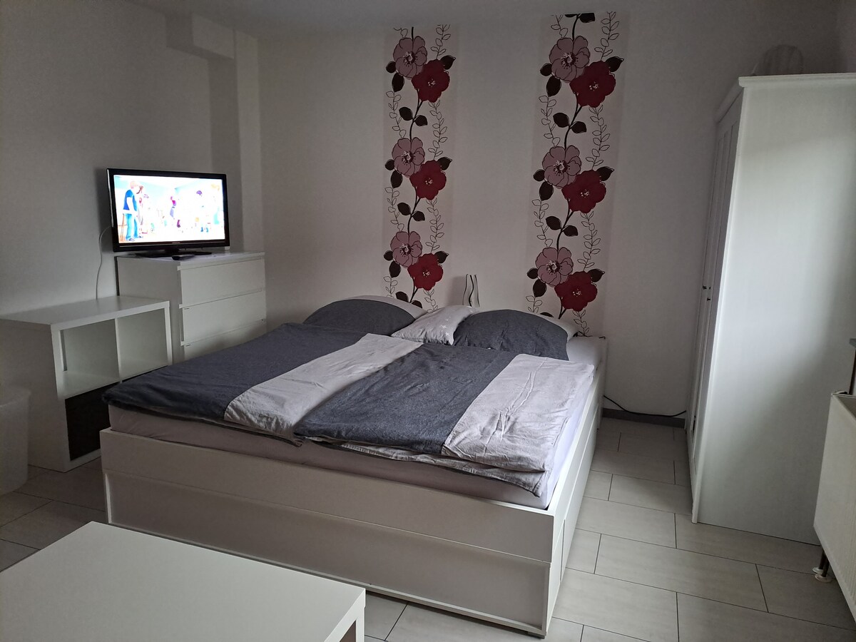 Grazioso appartamento con 1 camera da letto. Doccia e servizi igienici. Letto Hermes di Ikea estraibile per diventare un letto matrimoniale. Scrivania, scaffale, armadio. Mini cucina con acqua e due piastre di cottura. Macchina per il caffè e zona salotto. A 8 minuti dalla stazione ferroviaria. Direttamente alla stazione centrale e alla fiera / Rüttenscheid.