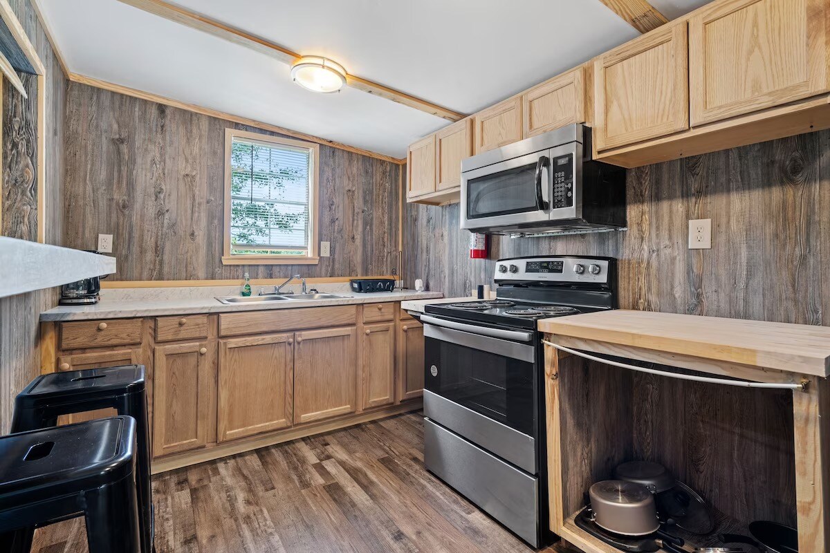 Welcome to Cabin #4 at ScrappyJax Campground! This renovated studio cabin provides the perfect intimate retreat for couples or solo adventurers looking for a cozy home base after exploring the natural wonders of the Ouachita Mountains. This compact and efficient space is designed with comfort in mind, offering a seamless blend of rustic charm and modern amenities. Unwind on your large private deck, fire up the propane grill for an easy meal, and get ready to rest and recharge.