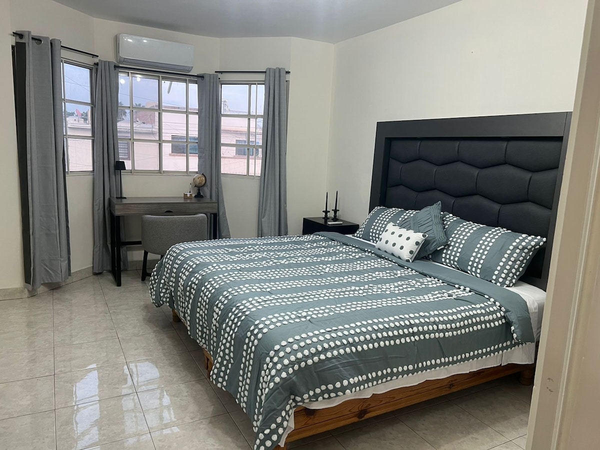 Magnifico appartamento, arredato e molto centrale. Luminoso ed elegante. Dispone di: 2 camere da letto 1 letto matrimoniale 2 letti singoli 1 bagno e mezzo Sala da pranzo Patio ricreativo con barbecue Area di lavoro Mini split in ciascuna delle sue aree Cucina integrale Servizio TV e WiFi ad alta velocità per lavori da casa Netflix Roku Tv A due isolati dal viale principale di Gómez Palacio dove si trovano centri commerciali, ristoranti e bar A 5 minuti dalla clinica IMSS#46