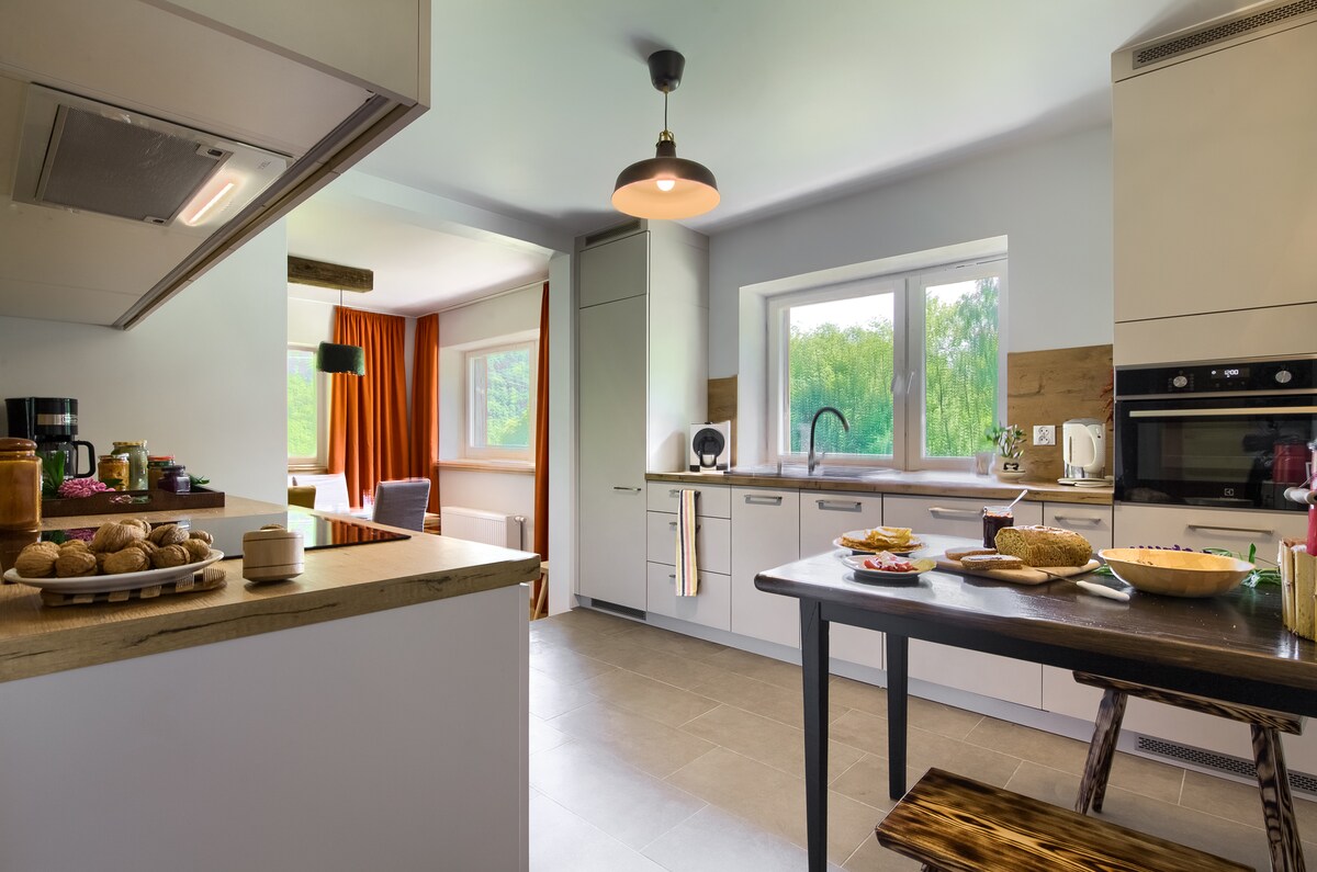 Offriamo un bellissimo e lussuoso appartamento in una villa centenaria, mantenuta negli anni '20. Un ampio soggiorno con un caminetto e una grande terrazza e due ampie camere da letto offrono comfort e libertà. I nostri ospiti hanno un garage. La villa si trova in una zona molto bella di Krynica, sul lato del Park Mountain.