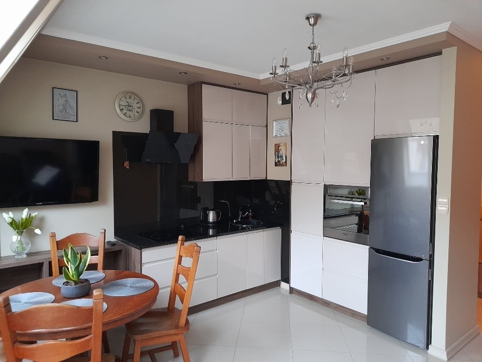 L'appartamento è circondato dal panorama del lago Ełckie e del fiume Ełk. Il complesso residenziale è di 43m2 ed è composto da una stanza con angolo cottura, camera da letto e bagno. Dotato di elettrodomestici, TV e cassaforte. Il condominio dispone di ascensore, cortile interno verde con parco, fontana e parco giochi. L'area della proprietà è recintata e sorvegliata 24 ore su 24. Nelle immediate vicinanze si trovano una passeggiata con ristoranti, una spiaggia cittadina, campi da tennis, un parco sportivo e ricreativo, uno skatepark e un parco avventura.