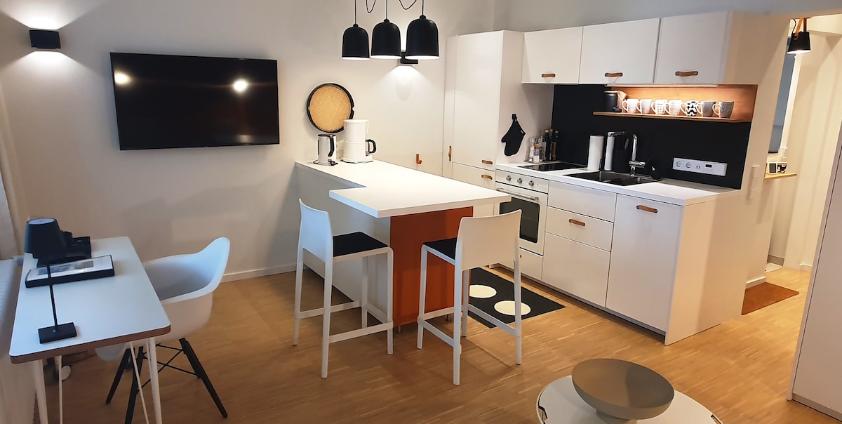L'appartamento è composto da un soggiorno con angolo cottura, bagno, camera da letto e un ampio balcone. Da sottolineare l'unità cucina ben attrezzata con elettrodomestici moderni (tra cui piano cottura a induzione, forno a convezione, frigorifero con freezer, lavastoviglie, lavatrice). Sono disponibili anche ad bilancia da cucina, grattugia, centrifuga per insalata, spremiaglio. Il divano può essere convertito in un comodo posto letto (160x200) È disponibile anche un grande schermo TV a schermo piatto. Non c'è deliberatamente NESSUN WI-FI