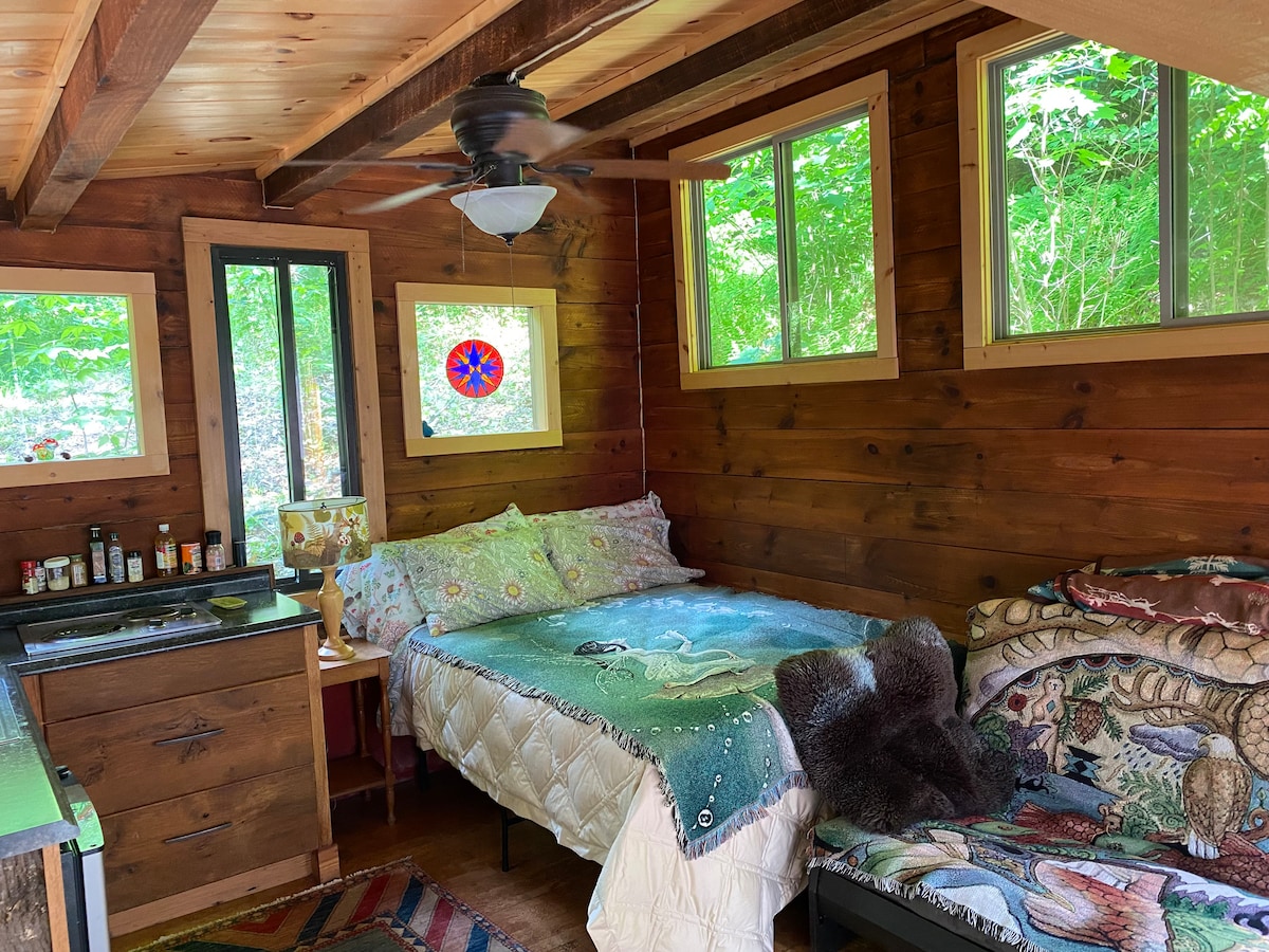 The Hobbit House is a tiny house (15x11'); Full size bed, futon/couch, outdoor tub, shower, electric fireplace, patio, picnic table, fire ring, and outhouse with composting toilet. The patio overlooks a pond and is part of a 53 acre forested property in the Blue Ridge. WiFi is now included. Glamp in style! The main lodge is just up the driveway if you need to contact the host. The outdoor shower/tub is NOT fully enclosed or private, and may be turned off in a freeze. Nature lovers only!