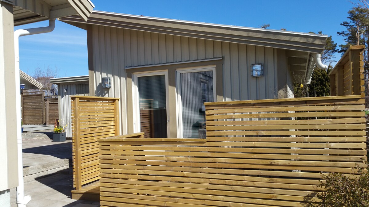 Un soggiorno con ingresso indipendente e ampio terrazzo sotto il tetto con mobili da esterno nonché bagno con riscaldamento a pavimento e WC/doccia. Nella sala è presente un tavolo da bar con 2 sgabelli da bar, TV, microonde, frigo, bollitore elettrico. È presente un grande letto matrimoniale e la possibilità di prendere in prestito una culla in più (fino a 2 anni). Parcheggio gratuito direttamente adiacente all'appartamento. Distanza a piedi circa 400 metri dal porto turistico con pontili, negozi, ristoranti, banca e Systembolaget. A circa 800 metri dal nuoto e dalla spiaggia.