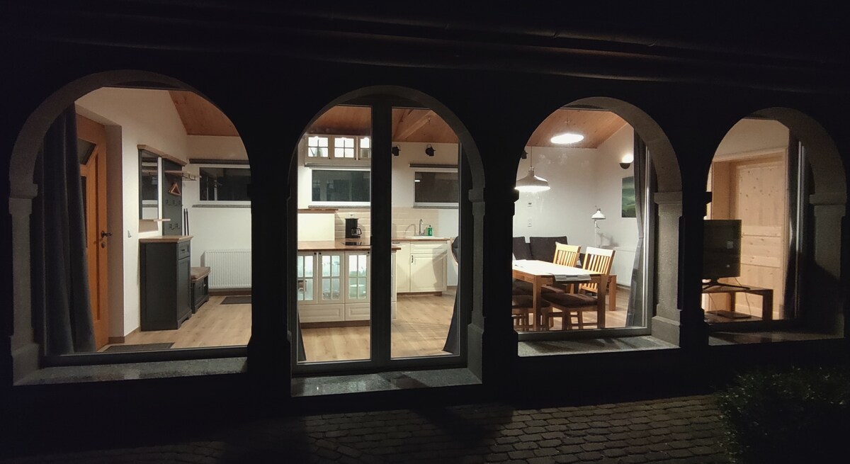 Casa sopra Weimar, lontano dal trambusto della città. Nella nostra piccola casa in mattoni arredata con cura, proprio sul vigneto, nella nostra grande proprietà privata simile a un parco, ci si può rilassare. La giornata può iniziare con una colazione e una buona tazza di caffè, ad esempio all'alba sulla terrazza con una splendida vista. La camera da letto con ampio letto matrimoniale si trova al piano superiore della galleria. Il nostro cane da fattoria Cleo è ben educato e accoglie con gioia tutti gli ospiti.