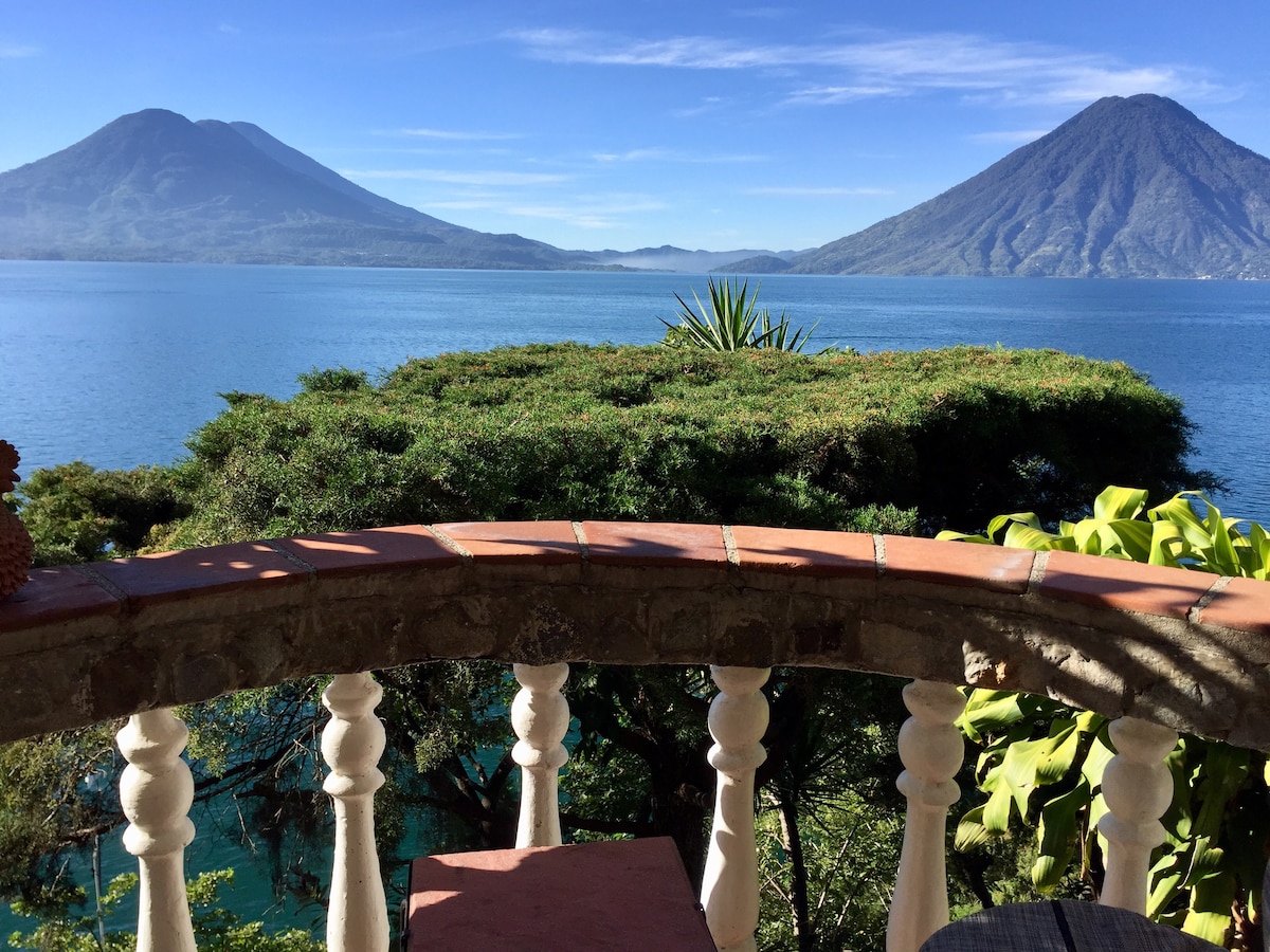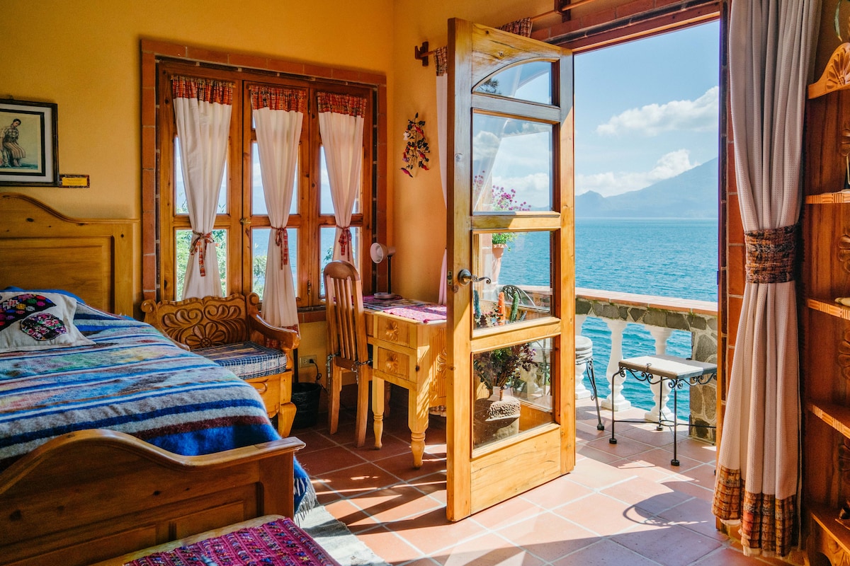 La Casa del Mundo è raggiungibile SOLO con la barca. CARATTERISTICHE SPECIALI: suite molto spaziosa e confortevole. Balcone privato con vista panoramica mozzafiato sul lago. Splendida vista sul lago, sui vulcani e sui villaggi circostanti dall'interno della stanza. Accesso a Internet wireless gratuito. POSIZIONE, LETTI E CAPIENZA: Comodamente situato a un piano sopra l'ufficio e la zona pranzo. 1 Queen, 1 Single e 1 Extra Single Opzionale. Può ospitare fino a 4 persone. Suite (Bagno privato).