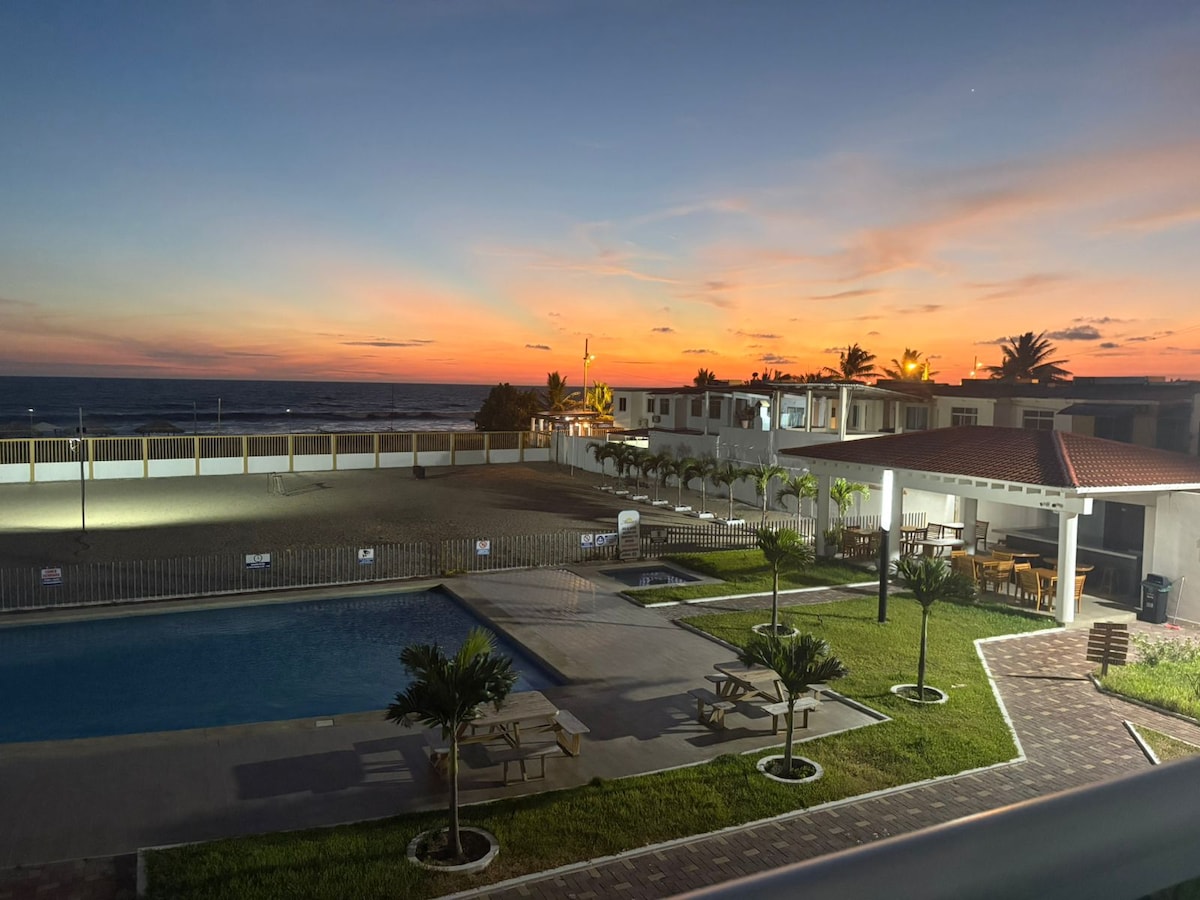Appartamento ai piedi del mare presso l'Ocean Club, posizione strategica a 45 minuti da Guayaquil, con privilegiata vista mare, ha piscina, vasca idromassaggio e zona sociale. Privacy e tranquillità per divertirsi con la famiglia o con gli amici. Garita de entrada al complesso e alla reception 24 ore su 24. Dispone di un purificatore d'acqua, Wiffi, TV diretta, Netflix, parcheggio
