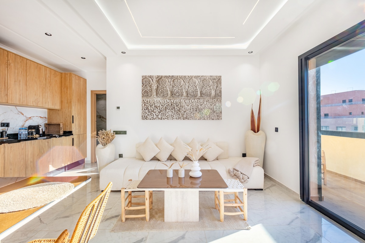 Modern, bright apartment in the heart of Gueliz. Smart lock entry, stylish living room with TV, equipped kitchen, 2 elegant bedrooms and a stone bathroom with a “waterfall” shower. Walking distance: 📌 Distances from: • 🕌 Jamaa El Fna Square – 10 min • 🌴 Majorelle Garden / YSL Museum – 5 min • 🏰 Bahia Palace – 15 min • 🕌 Medina / Souks – 10 min • ✈️ Marrakech Menara Airport – 12 min • 🛍️ Carre Eden / Starbucks – 3 min • 🍽️ Restaurants & cafés – right at the doorstep