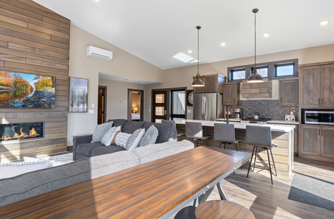 Retreat lakeside at Leisure Lodge, 2 hrs from MSP/Fargo: • 4 king beds, 4 Twin XLs, pullout queen, portable crib • 3 baths (one on each level) • Fully stocked kitchen w/ indoor & outdoor dining for 10+ • Spacious year-round home with indoor garage parking, not a seasonal cabin • Hot tub + fire pit w/ wood • Paddleboat, kayaks & nearby trails • Cozy gas fireplace & crisp lake views • 100+ five ⭐️ reviews •Decorated w/ indoor lighted trees throughout the winter for groups to celebrate holidays