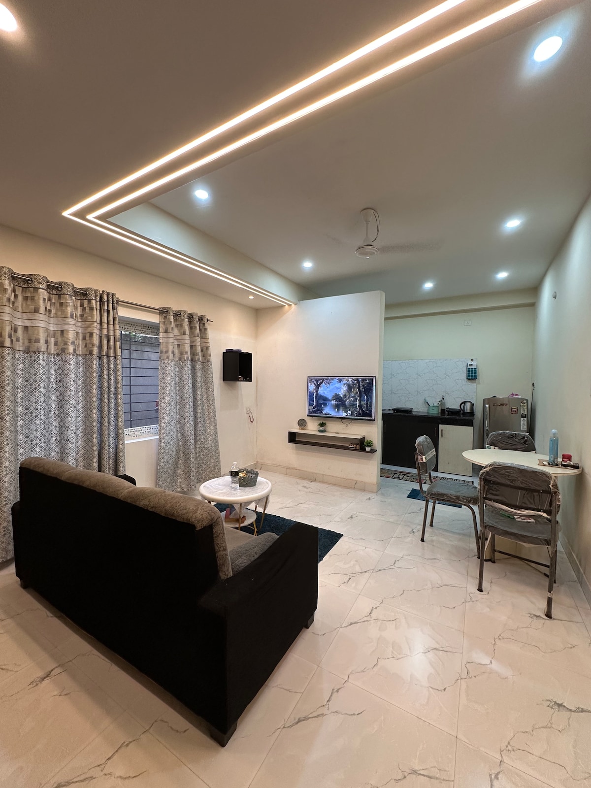 Rilassati con tutta la famiglia in questo alloggio tranquillo dove soggiornare, organizzare feste ed eventi in famiglia. La struttura è un appartamento di 1bhk arredato con 1 camera da letto con tv e letto king size, 1 ingresso con 1 letto, 1 cucina e 1 bagno. Tutti i servizi sono disponibili per cucinare e soggiornare.