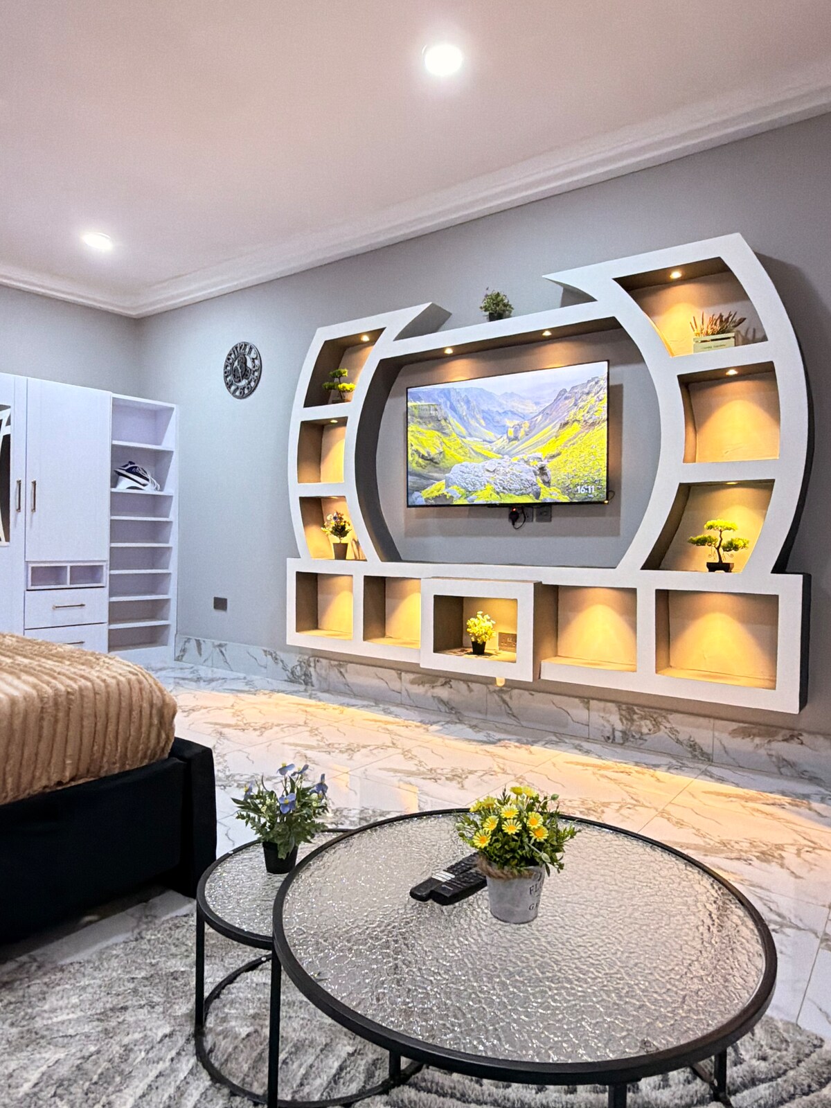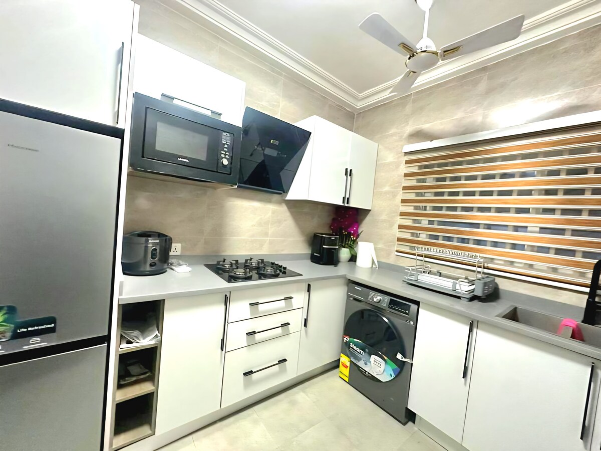 Modern comfort in a stylish, beautifully lit apartment with clean contemporary finish & a warm evening glow that instantly feels upscale & inviting. Located in a quiet neighborhood 19mins from the Airport, 17 from accra mall,10mins from Atlantic Mall, and about 30 mins from the Aburi Mountains, offering easy access to shops, business hubs & leisure centers ..You’re never far away from everything you need yet still tucked away enough to relax & unwind. A chic retreat you’ll love coming home to.