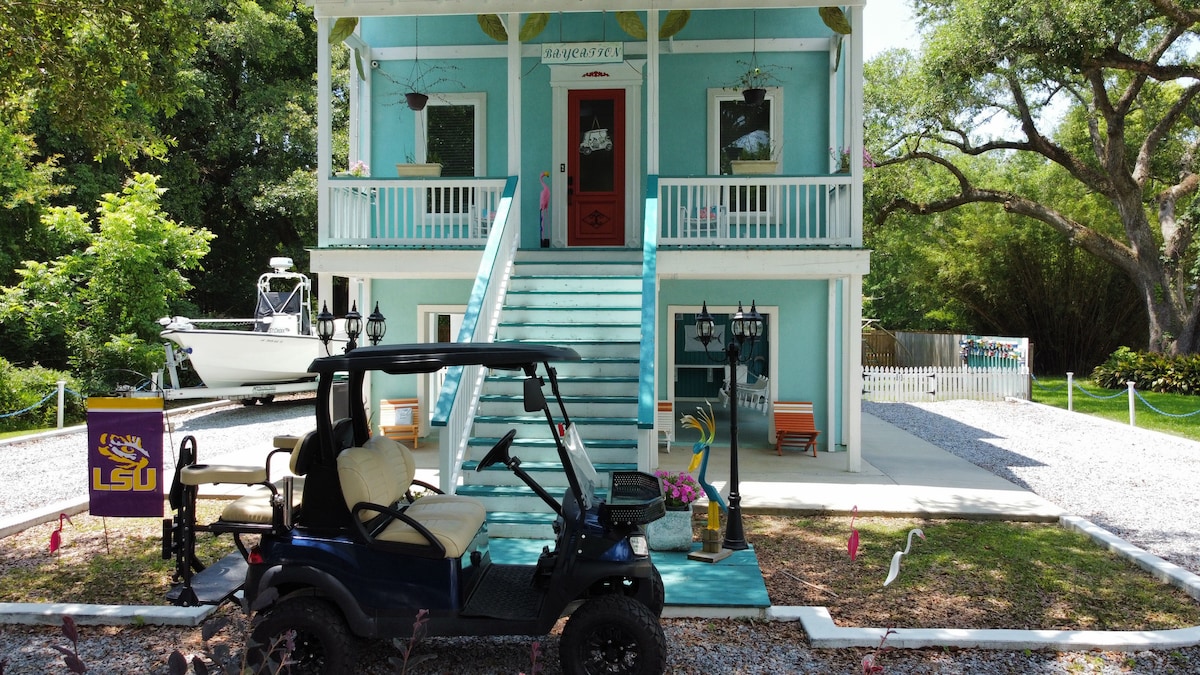 Casa sopraelevata con vista sulla spiaggia, 2 camere da letto, 4 letti, 2,5 bagni, fascino del sud e stile costiero moderno. 149 m² a pianta aperta, interni di design! Cucina da chef/ampio soggiorno/grandi finestre. Balcone coperto e ventilato, zona pranzo all'aperto. Golf cart incluso! Parcheggio coperto e divertimento. Accesso diretto al golfo/spiagge bianche. Il vialetto può ospitare 4 auto e una barca di 7,3 metri. Ampio cortile ombreggiato da querce vive. Vasca idromassaggio/braciere/griglia a gas/sala giochi con bagno di servizio. A 5 minuti dalla storica Bay St. Louis. A 10 minuti dai casinò. A 1 ora da New Orleans. Può ospitare 6 adulti.