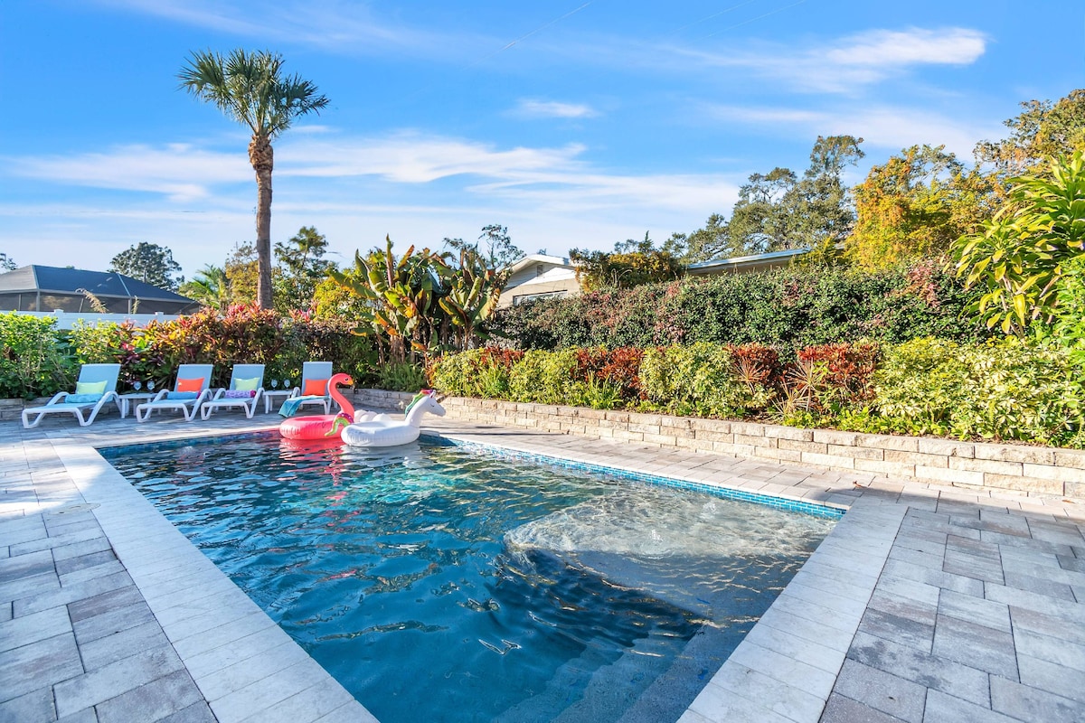 Unique tropical oasis complete with 2 swim out bedrooms, Tiki Hut and tiki bar! LGBTQIA + welcome! Hablo Español. Pet haven. Tropical Airbnb retreat! Our unique resort-style heated PRIVATE pool with waterfalls and dual sun-shelves, / in pool loungers, surrounded by lush landscaping, is a private oasis. 3 bedrooms, with Large 3rd bedroom with 2 queen beds At night the outdoor space comes alive with pool and landscape lighting! You wont want to leave the house!