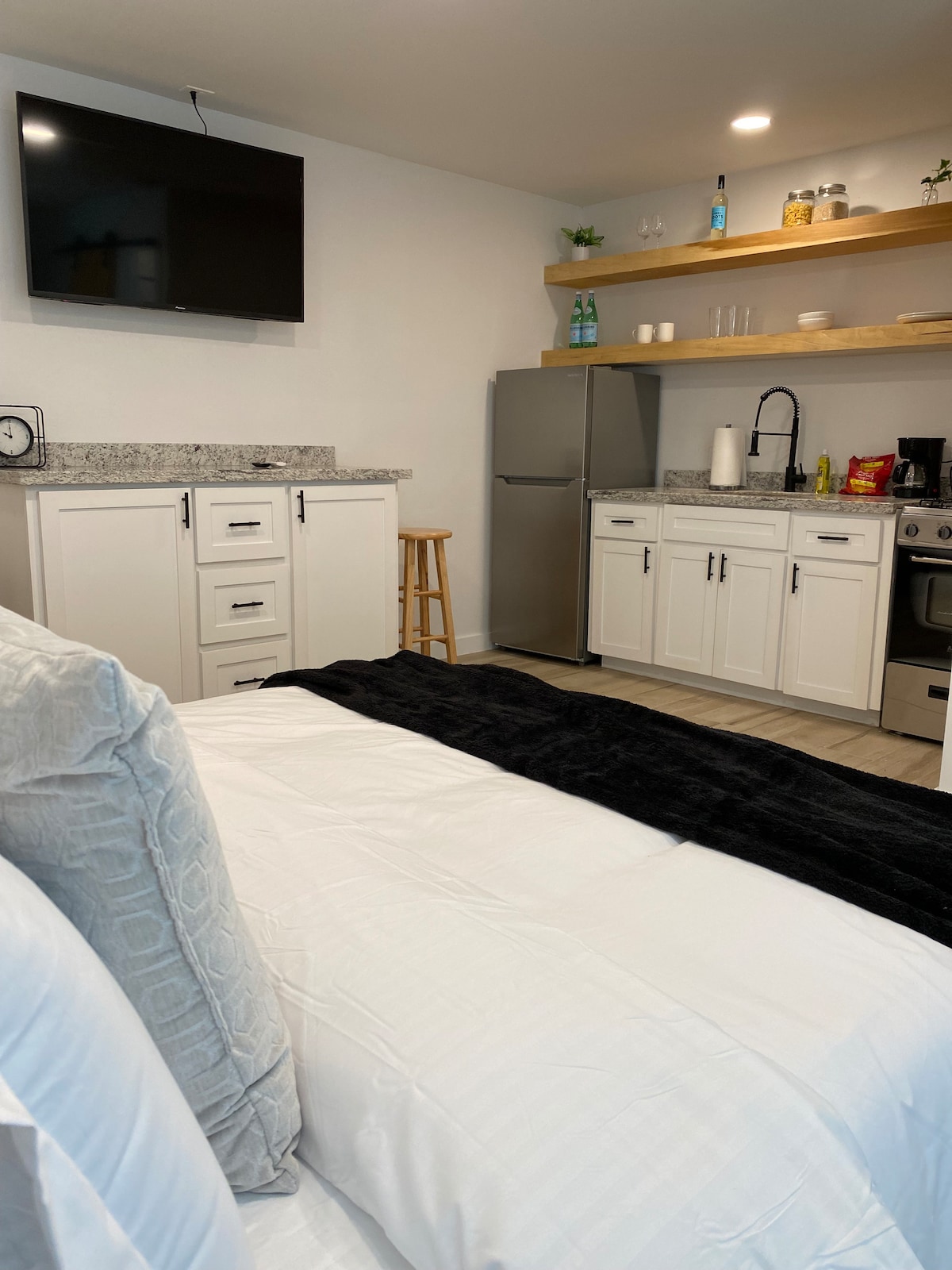 Accogliente e moderna suite per gli ospiti in stile fattoria nascosta dietro la nostra casa, completamente indipendente con circa 6 metri di separazione. A 350 piedi quadrati, comprende un comodo letto matrimoniale, divano letto estraibile, bagno completo, mini cucina (fornello, forno a microonde, frigorifero, lavandino), la propria lavatrice/asciugatrice e un sacco di spazio nell'armadio. Pulito, elegante e progettato con cura per soggiorni brevi o weekend. Piccolo spazio, grande comfort. Spazio calmo ed elegante.