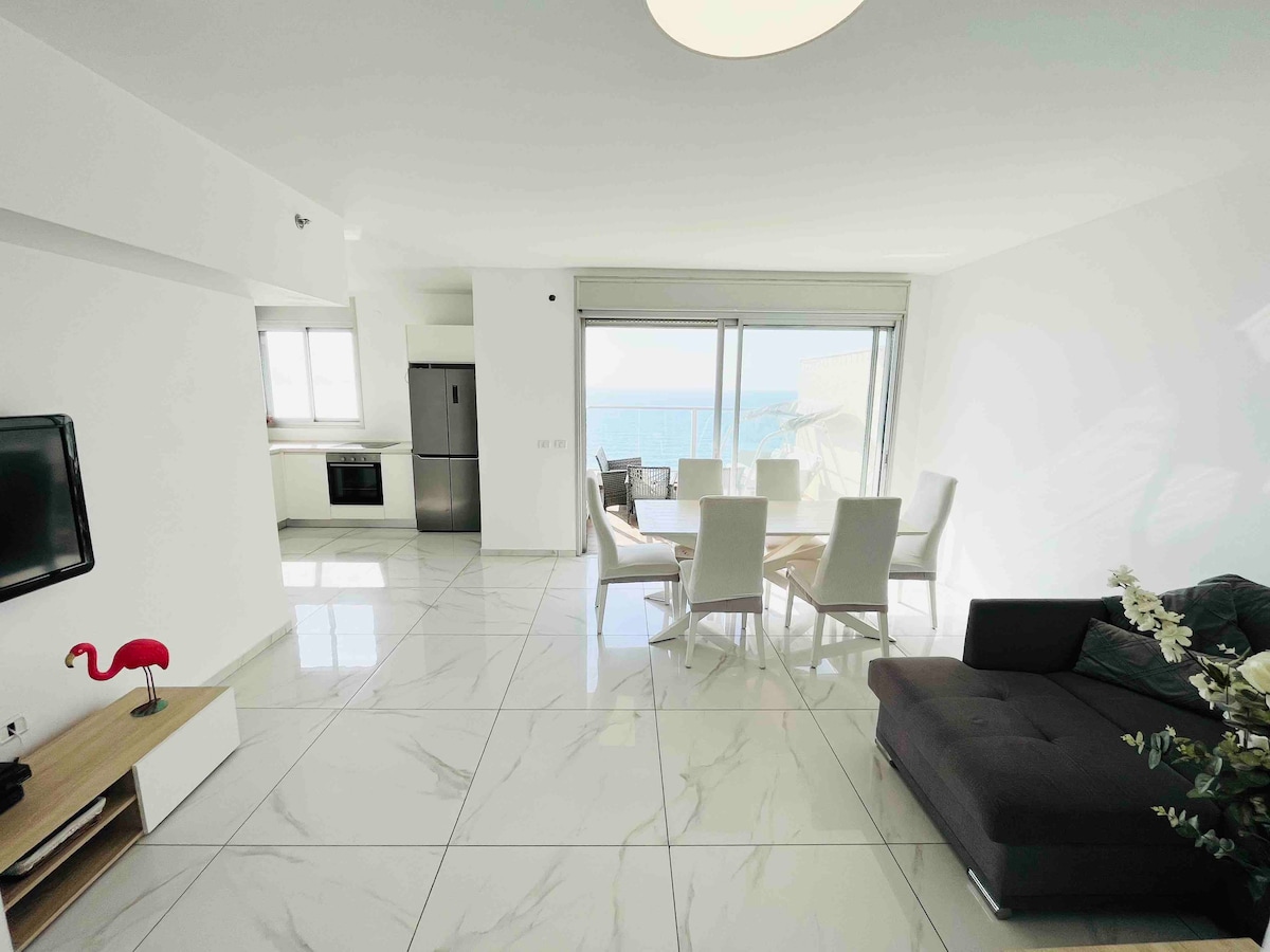 Goditi la vista panoramica sul mare, la brezza marina rinfrescante e il suono sereno delle onde, da ogni angolo dell'appartamento con 3 camere da letto. - 2 camere da letto, con letto king-size e matrimoniale europeo. Entrambi dispongono di bagno privato, che garantiscono il massimo comfort e privacy. - Soggiorno, cucina e zona pranzo completamente attrezzate - 1 minuto a piedi dalla spiaggia, dalle caffetterie, dai ristoranti, dai negozi sul lungomare di Nitza Avenue. La spiaggia stagionale, con servizi di spiaggia e soccorso, ti aspetta in discesa. - Centro città a pochi passi.