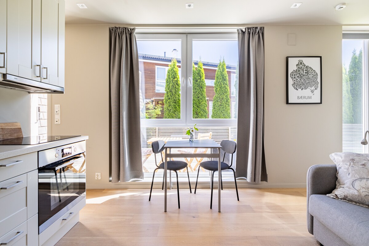 Leiligheten er på ca 55 m2 og er møblert, har nytt bad og kjøkken, godt med skap og er lys innvendig. Det er vinduer på 2 sider; kjøkken har vindu med morgensol og soverom/stue har vindu der solen er til ca 20-21 om sommeren. Det er dobbelfløyet inngangsdør med glass i full bredde. Friområde og skog er 100 meter unna, et eldorado for voksne og barn sommer og vinter. Det er 8 minutter gange til dagligvare butikk, og god kommunikasjon til Oslo sentrum, Lysaker, Bekkestua, Sandvika mm.