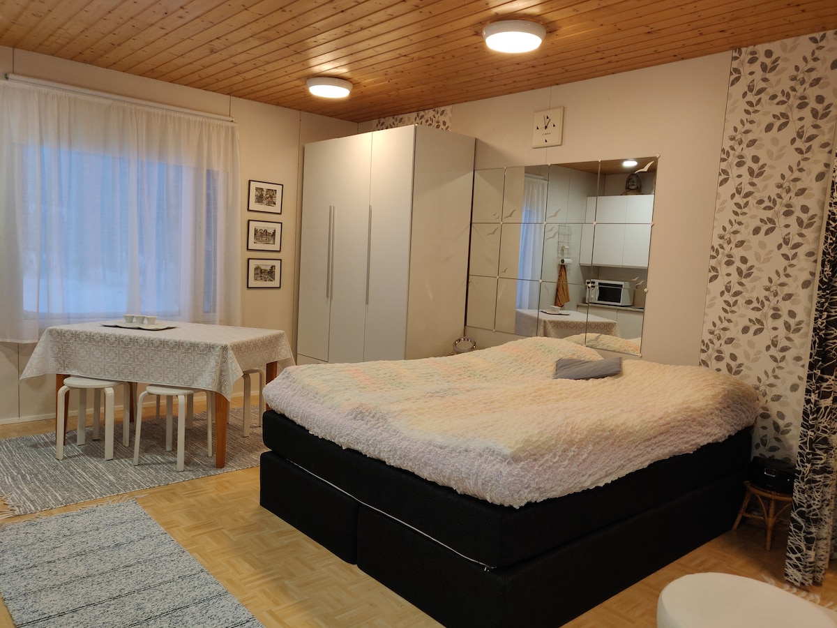 Moderno appartamento con una camera da letto di 47,5 m² a soli 10 minuti a piedi dal centro. Facile accesso ai mezzi pubblici e a tutti i servizi che la città offre. L'appartamento include una cucina completamente attrezzata, una Smart TV UHD da 49", il wifi veloce e una sauna privata! Nella camera da letto è presente un letto matrimoniale, mentre nel soggiorno c'è un materasso supplementare da 80 cm. L'appartamento è adatto a gruppi di 3 persone! Parcheggio in garage riscaldato. Possibilità di ricaricare veicoli elettrici al costo di 20 centesimi al kWh.