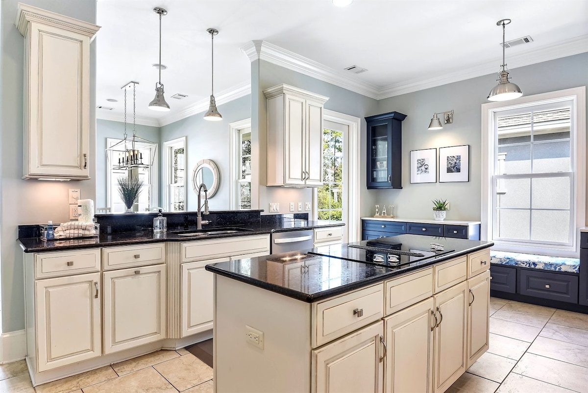 La casa di proprietà privata di 185 metri quadrati si trova su un terreno boscoso all'angolo, comodamente situato all'ingresso del Sea Pines Resort. Questa casa con 3 camere da letto e 2 bagni è stata completamente rinnovata nell'agosto 2020, con un invitante arredamento costiero di ispirazione francese per un'atmosfera rilassante e accogliente. Lo chalet "Sea La Vie" si trova a pochi passi da negozi di alimentari, negozi e ristoranti. Un breve tragitto in auto o in bicicletta ti porterà al Beach Club privato, che ospita ristoranti e bar sull'oceano, strutture di lusso e ampie spiagge. Bienvenue!
