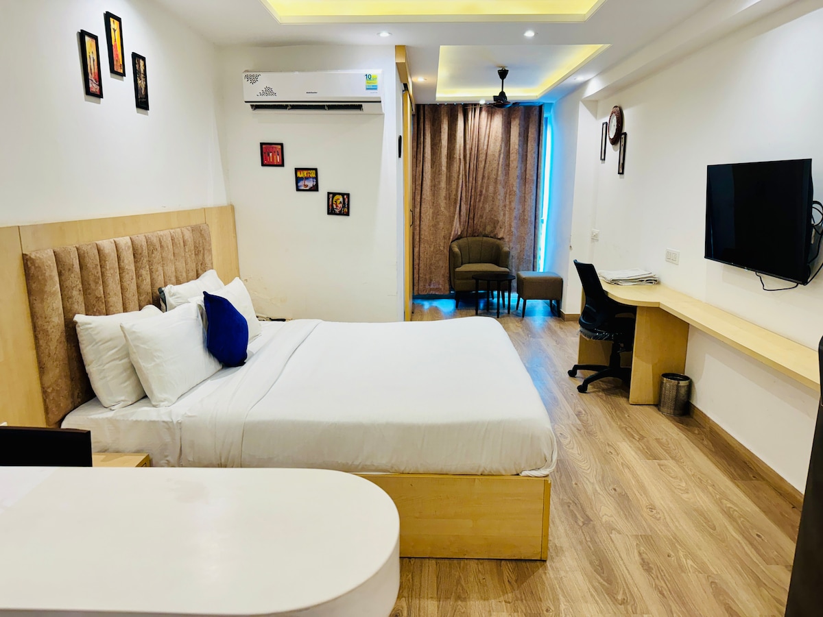 Rilassati e rilassati in questo monolocale tranquillo e lussuoso con il calore di casa e l'atmosfera di un hotel di fascia alta. Arredato con un soffice letto matrimoniale grande e arredi moderni. Servizi: Negozio di alimentari h24 Angolo cottura moderno WiFi e TV ad alta velocità Parcheggio custodito fuori dalla torre, ma protetto 24 ore su 24, 7 giorni su 7 I primi 2 piani hanno negozi commerciali, che offrono: Sessione di lavanderia Salone Caffetteria Negozio di medicinali Facile accesso all'India Expo Mart, Buddh International Circuit. Perfetto per coppie, viaggiatori singoli o partner commerciali.