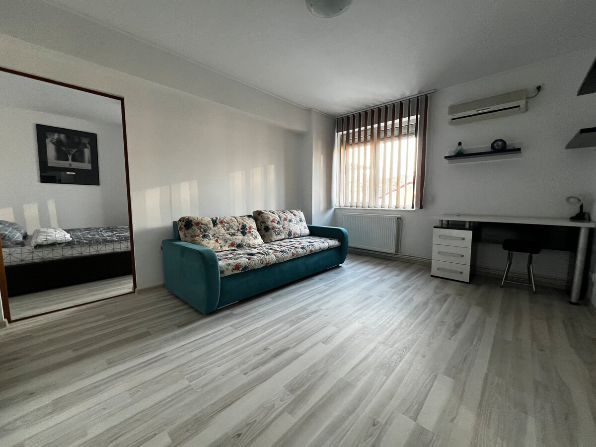 Alloggio accogliente a Pitesti. Adatto a coppie, avventurieri solitari e chi viaggia per lavoro. Alloggio interamente nuovo, arredato con mobili ed elettrodomestici nuovi, situato nel cuore del centro di Pitesti, vicino a molti ristoranti, caffetterie e supermercati. Il monolocale al 1° piano dispone di una zona notte con divano estensibile per 2 persone. Il monolocale dispone di cucina completamente attrezzata, frigorifero, cucina a gas, forno elettrico, macchina per il caffè, lavatrice, TV via cavo, Wi-Fi gratuito, parcheggio pubblico gratuito sul retro dell'edificio.