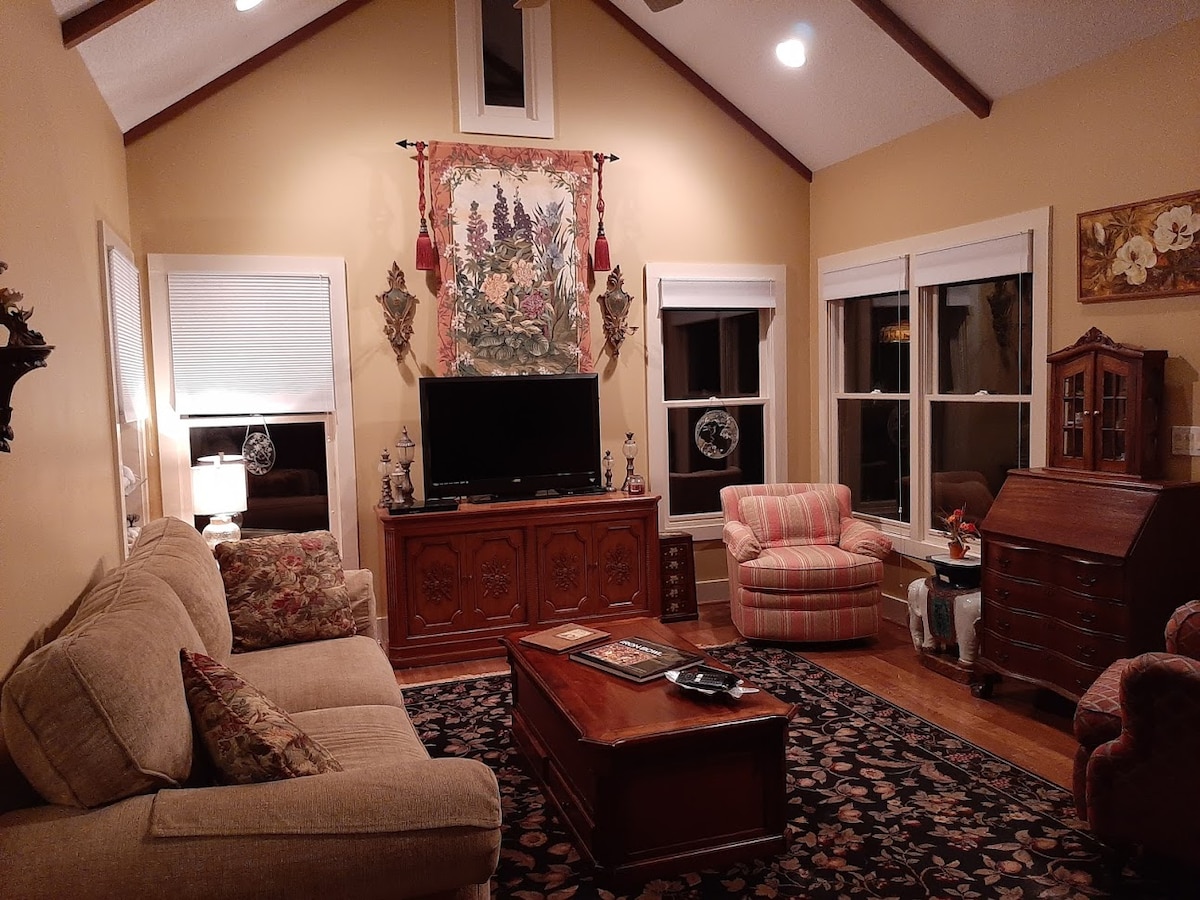 La nostra seconda casa è un mix di moderno di metà secolo e "baita nel bosco". Si trova su 2 acri di terreno boscoso e confina con una montagna con affioramenti rocciosi. La zona giorno principale (soggiorno, zona pranzo e cucina) è rialzata di circa 4 gradini, mentre la camera da letto e il bagno si trovano al livello principale. È presente un ampio bagno con doccia. Di fronte al divano a U integrato, c'è un caminetto elettrico circondato da una sporgenza in pietra. Sono disponibili abbondante materiale di lettura e 2 TV.