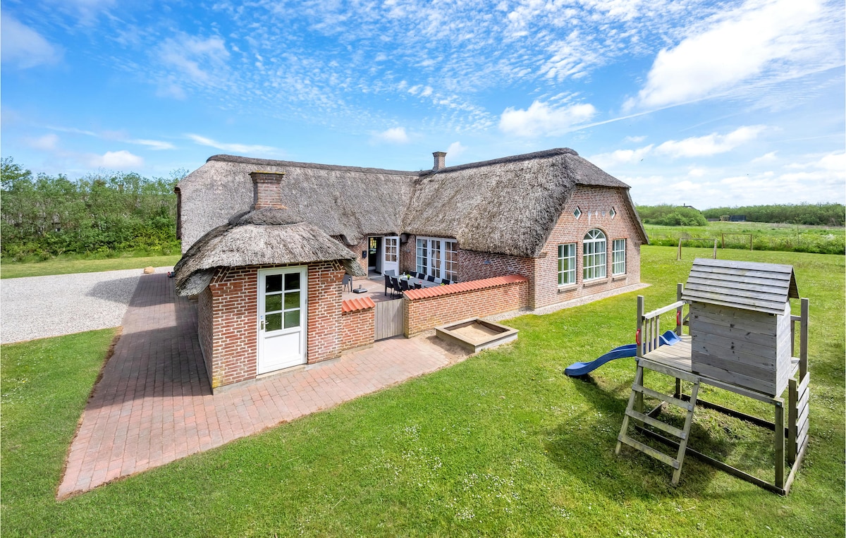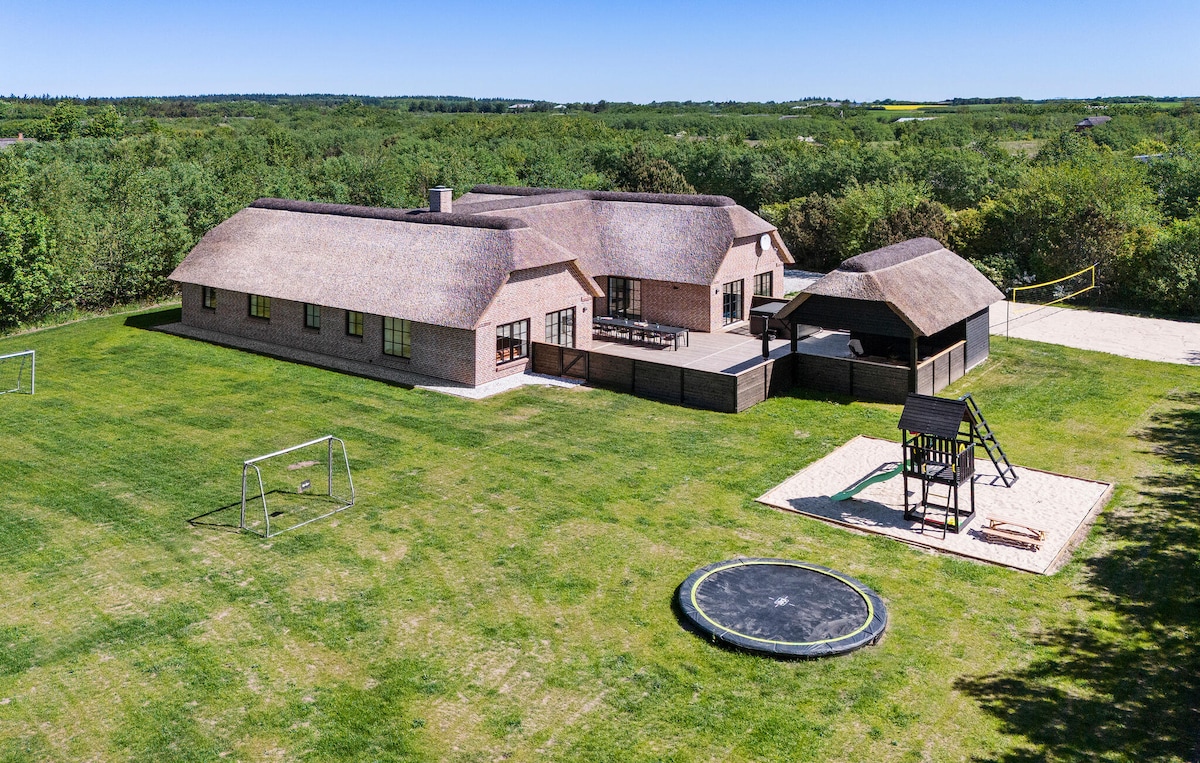 Illeborgvej 35, Fjand Just 1,200 meters from the North Sea coast lies this impressive holiday home, built on a spacious 5,700 m² natural plot that offers plenty of room for both relaxation and fun activities for the whole family. The house features 8 bedrooms, 4 bathrooms, and 4 cozy loft areas, providing ample space for up to 20 guests. It’s ideal for several families or a large group of friends wishing to spend their holiday together in beautiful surroundings. The large pool area is the natural gathering point of the house and includes a 20 m² swimming pool with counter-current system, water slide, spa for 4–6 people, and a relaxing sauna. A spacious bathroom is also connected to the pool area, ensuring top comfort. There’s no shortage of entertainment here – for both children and adults. Indoors, you can challenge family and friends to games of billiards, table football, table tennis, darts, or enjoy the PlayStation 4. Outdoors, the extensive grounds offer a 5-hole mini golf course, volleyball court, football goals, trampoline, swings, and sandbox – as well as a cozy play loft for the children. The interior is tastefully decorated with modern furnishings and features two large flat-screen TVs. The wood-burning stove creates a warm and cozy atmosphere on cooler days. The spacious kitchen is designed for social gatherings and can accommodate 20 people. It is fully equipped with two dishwashers, a microwave, electric cookers, refrigerators, and a freezer – everything you need for enjoyable meals together. Outside, you can relax and enjoy the sunshine and fresh sea breeze on the large terraces, which include a barbecue and comfortable garden furniture – perfect for cozy evenings under the open sky. This holiday home combines comfort, entertainment, and a scenic location – the ideal choice for anyone wanting to enjoy both relaxation and activities in the heart of the West Jutland coast.