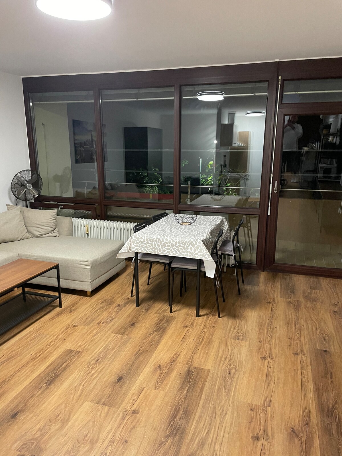Komplette, moderne, stilvolle 48m² 1-Zimmer-Wohnung mit Arbeitsplatz. Wohn-/Schlafbereich mit modernem, bequemen Schlafsofa mit 1,40x2,00 m Schlaffläche plus extra Topper für bequemes Schlafen. Zentrale Lage in sehr ruhiger Nebenstraße. Wohnküche mit Herd, Backofen, Mikrowelle, Kaffeemaschine, Wasserkocher, Kühlschrank und wunderschönem Massivholz-Hochtisch mit zwei Hockern. Großzügiges Bad mit extra großer Dusche, Waschbecken, WC. Ausgestattet mit Fön. Bei Extra-Wünschen gerne fragen.