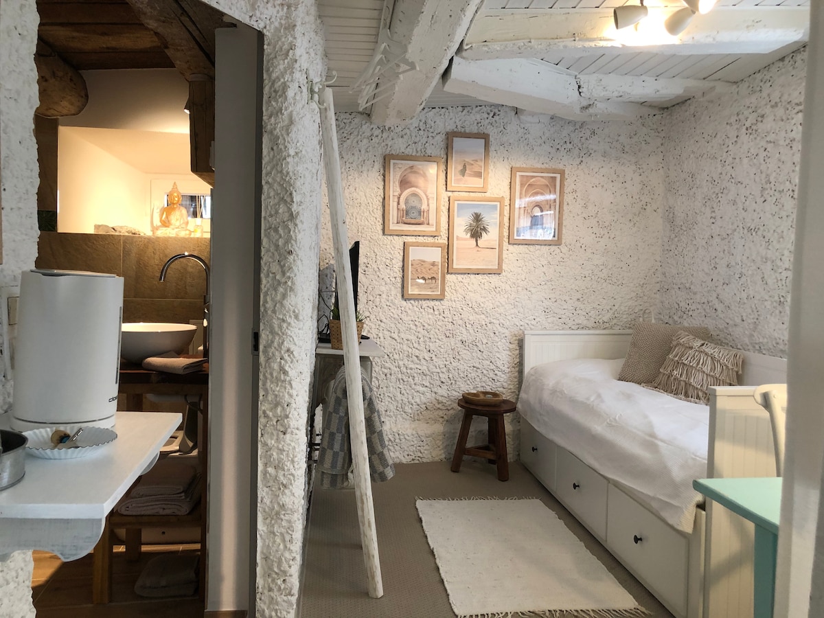 "Tiny-Haus Feeling" in un edificio storico. La piccola unità con ingresso indipendente comprende una camera da letto con letto e un piccolo tavolo da scrittura/pranzo. Un piccolo bagno confortevole con una bella zona doccia. I servizi includono una lavatrice, un piccolo frigorifero, un bollitore, una macchina per il caffè e una TV. È possibile fornire un posto auto. Previo accordo, è possibile utilizzare anche il giardino. Proprio nel centro di Dagersheim una piccola oasi di benessere.