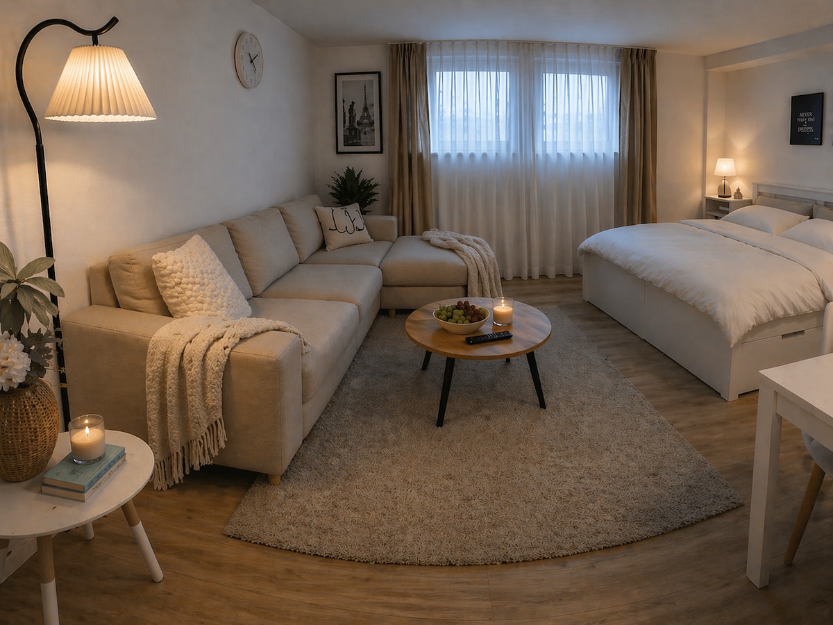 Modernes Einzelapartment mit Balkon & Tiefgarage – ideal für Geschäftsreisende oder Messebesucher. Ca. 5 Min zu Fuß zur S-Bahn-Station Echterdingen (S2/S3), von dort nur eine Station zum Flughafen/Messe und ca. 25 Min direkt ins Stuttgarter Zentrum. Auch die U-Bahn ist in Leinfelden-Echterdingen gut angebunden. Bäcker, Supermarkt und Restaurants sind fußläufig erreichbar. Highspeed-WLAN, Fußbodenheizung und flexibler Self-Check-in inklusive.
